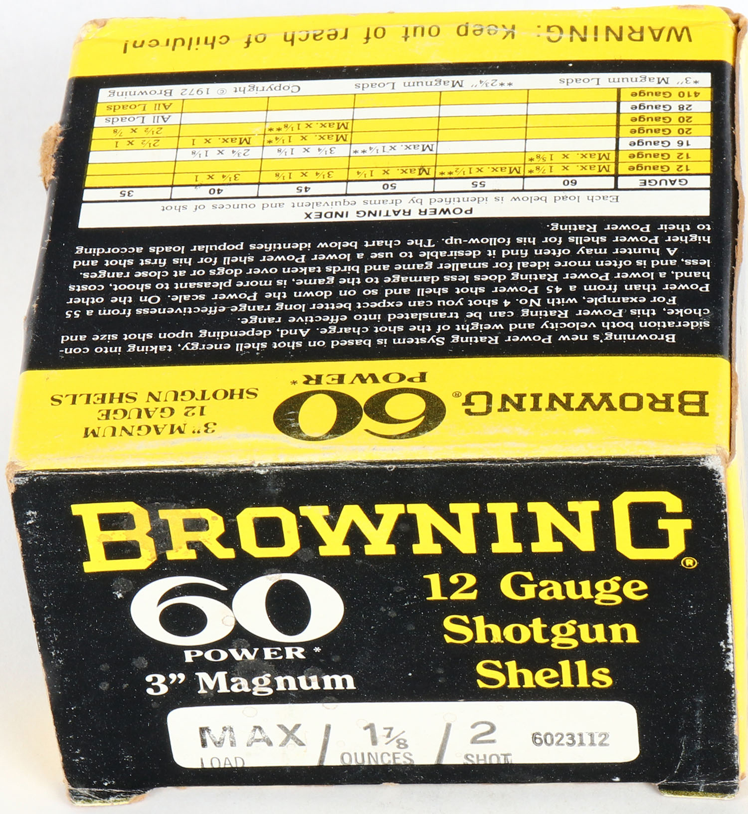 Browning, 60 Power, 12ga., 3'' Magnum, 1pc., Full, shot size 2, black, yellow & white box, box is solid with nice color, shells are excellent. Grade: Very Good ++ - Value: 10 to 40