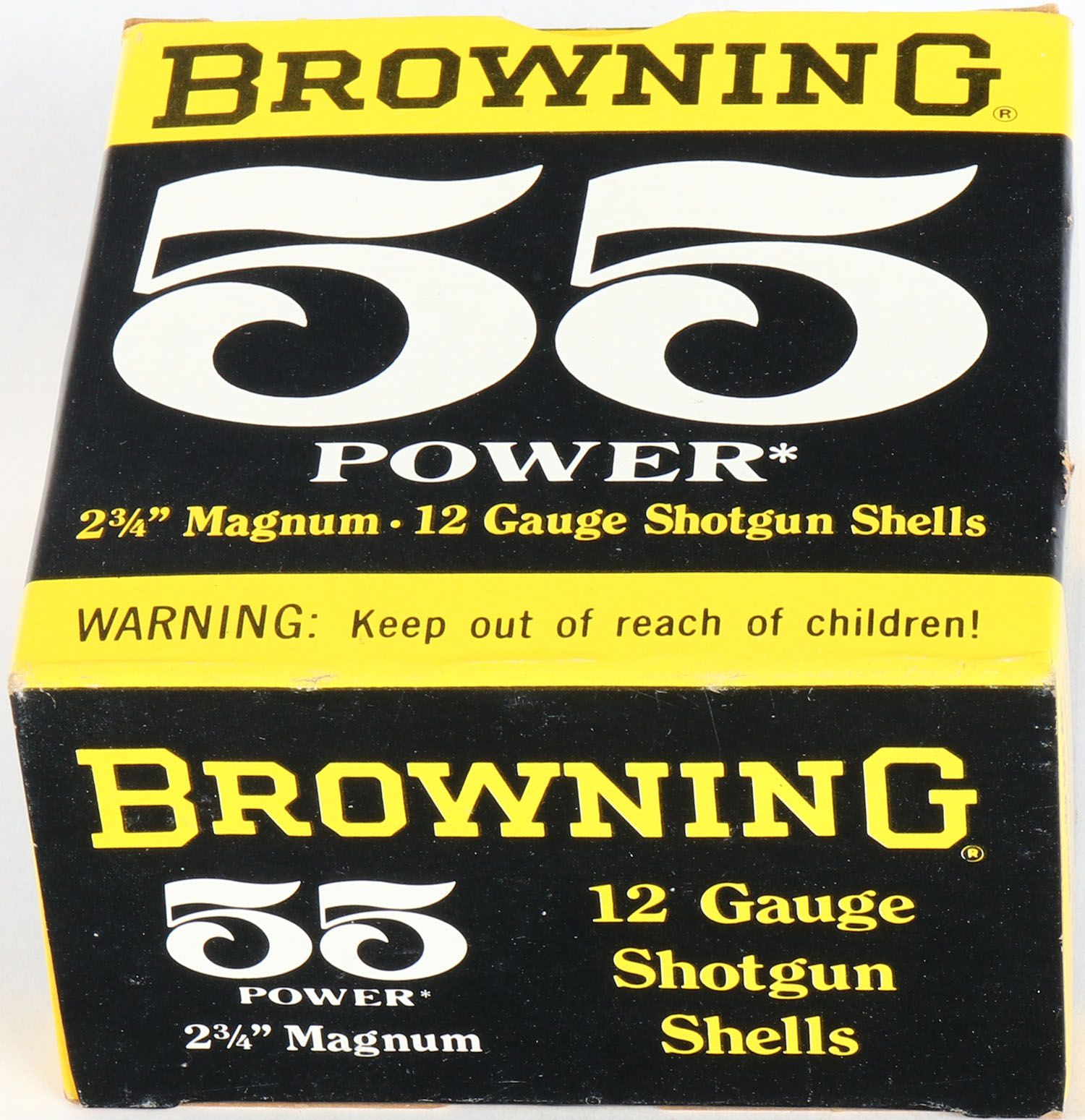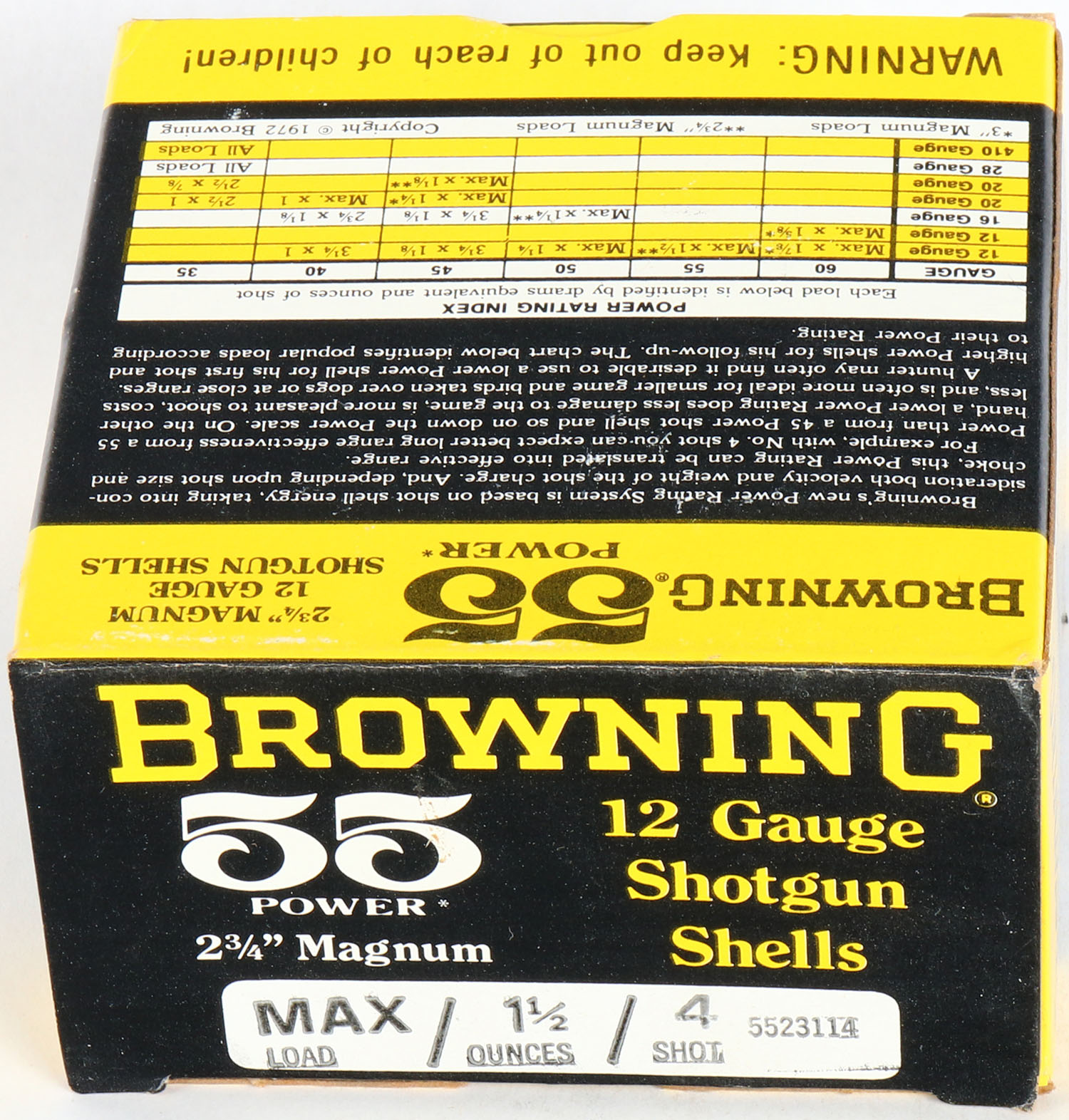 Browning, 55 Power, 12ga., 2 3/4'' Magnum, 1pc., Full, shot size 4, black, yellow & white box, box is very solid with great color, shells are excellent. Grade: Excellent + - Value: 10 to 40