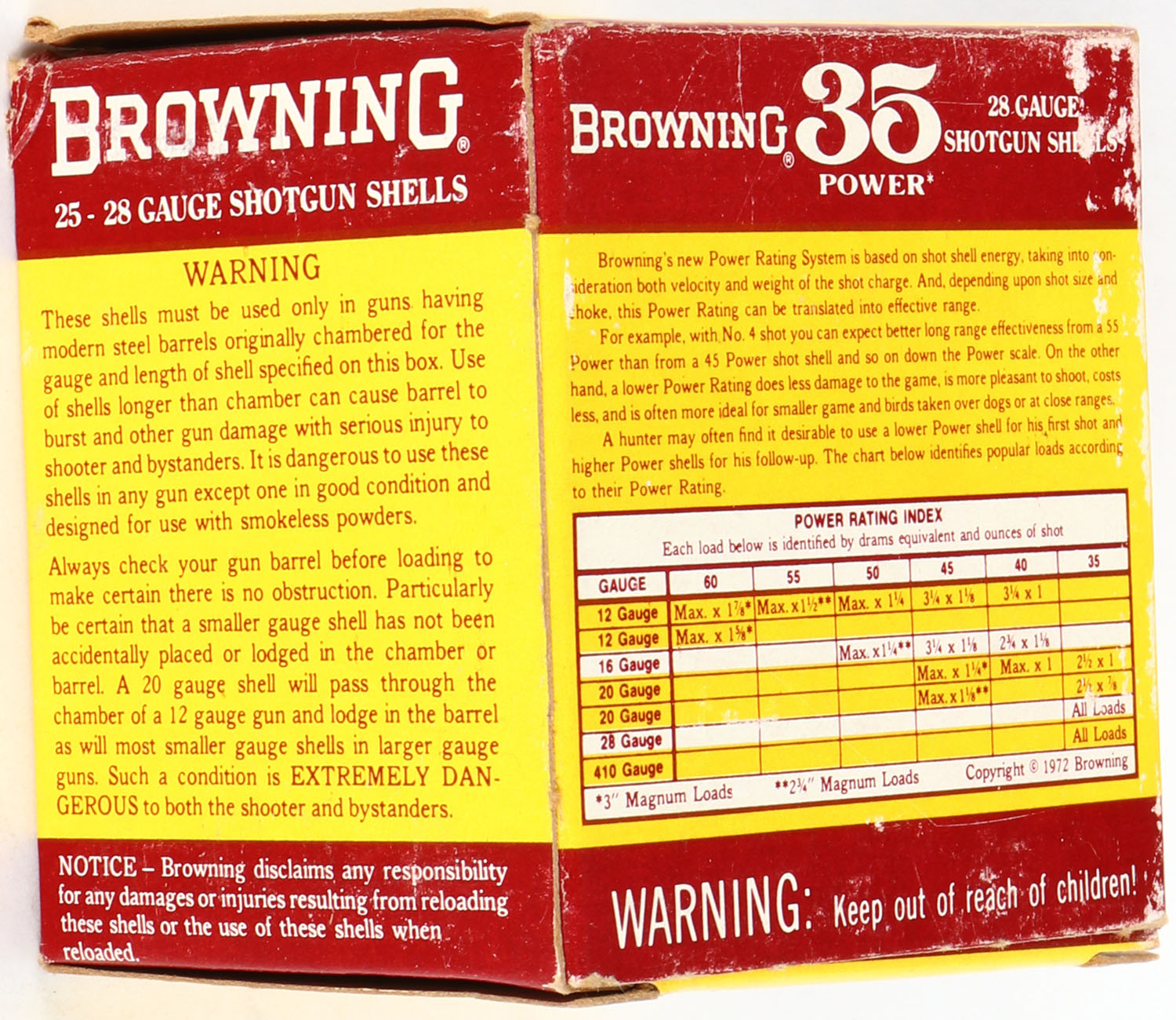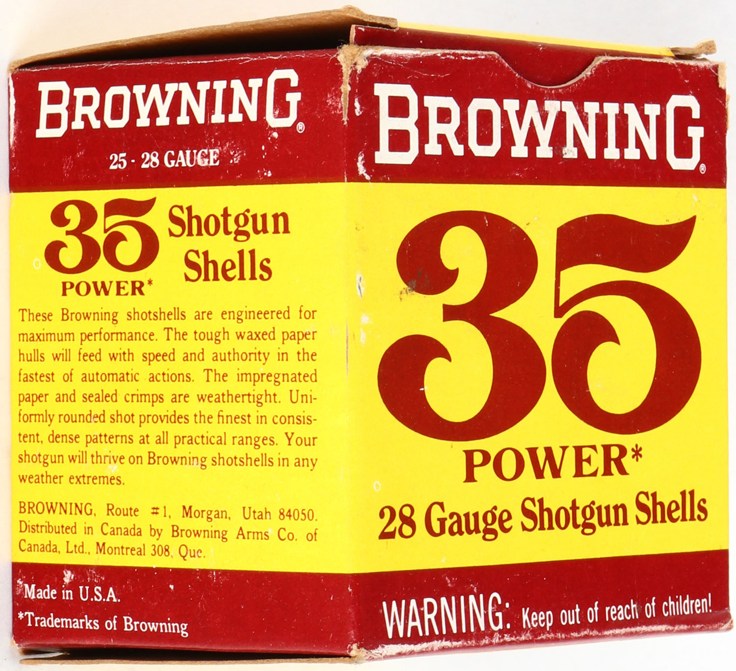 Browning, 35 Power, 28ga., 2 3/4'', 1pc., Full, shot size 9, maroon, yellow & white box, box is very solid with great color, shells are excellent. Grade: Excellent - Value: 10 to 40