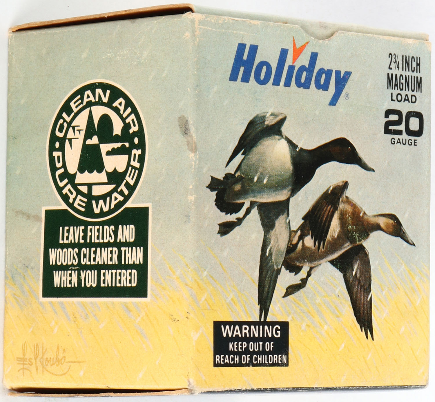 Holiday, Canvasbacks/Canada Geese, 20ga, 2 3/4'', 1pc., Full, shot size 4, multi color graphics by Les Kouba, box is very solid with light scuffing & excellent colors, Shells are excellent, HARD TO FIND! Grade: Excellent - Value: 50 to 200