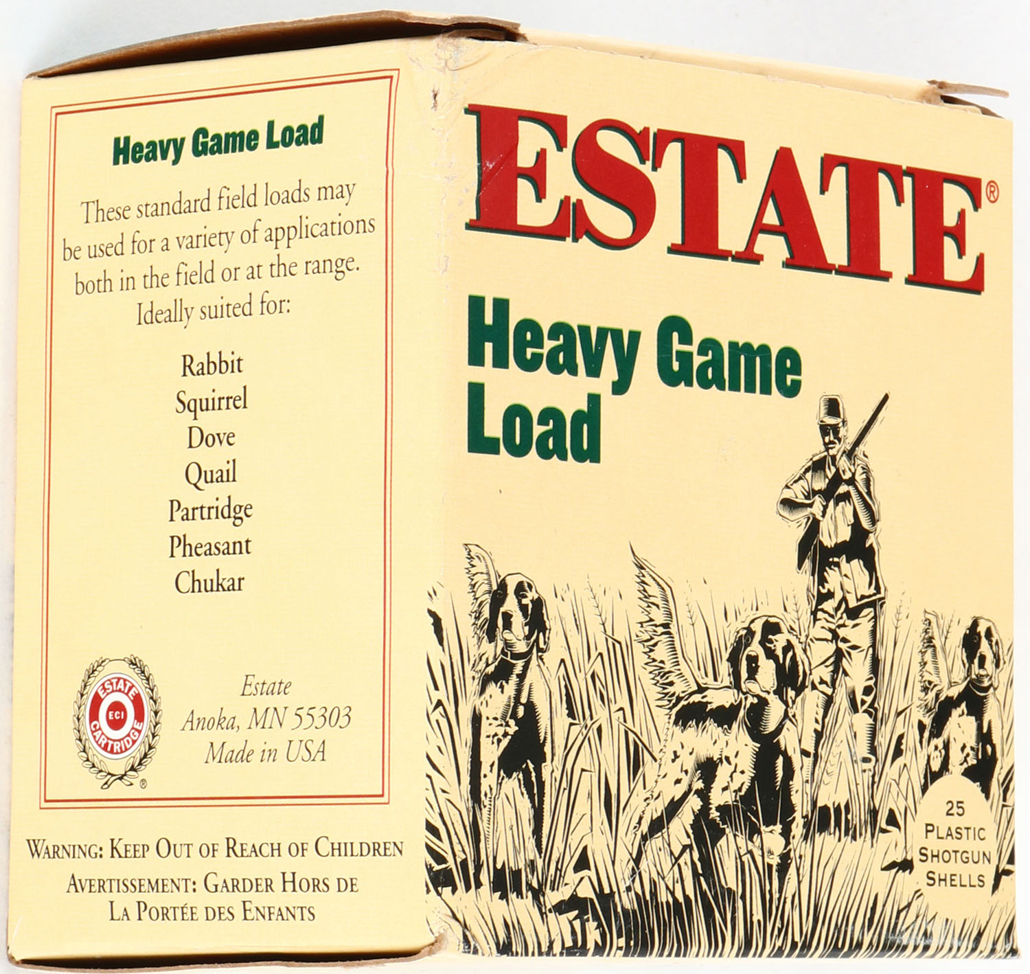 Estate, Heavy Game Load, 16ga., 2 3/4'', 1pc., Full, shot size 8, multi-colored box, box is solid with great colors, shells are excellent. Grade: Excellent + - Value: 10 to 20