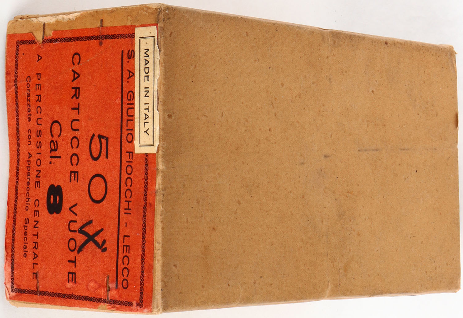 EARLY SHOEBOX by S. A. Giulio Fiocchi - Lecco, Vuote, 8ga., 2pc., Full, shot size NPE, box & label are very nice with no wear, NPE shells are Mint. Grade: Excellent ++ - Value: 50 to 500