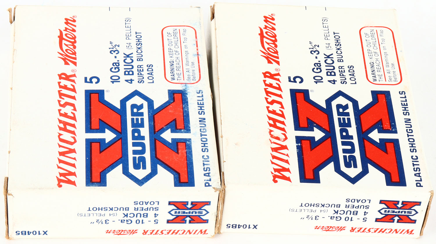 Lot of 2 Winchester, 10ga., 1pc., Appears Full, shot size 4 Buck, multi-colored box. Grade: Excellent - Value: 10 to 30