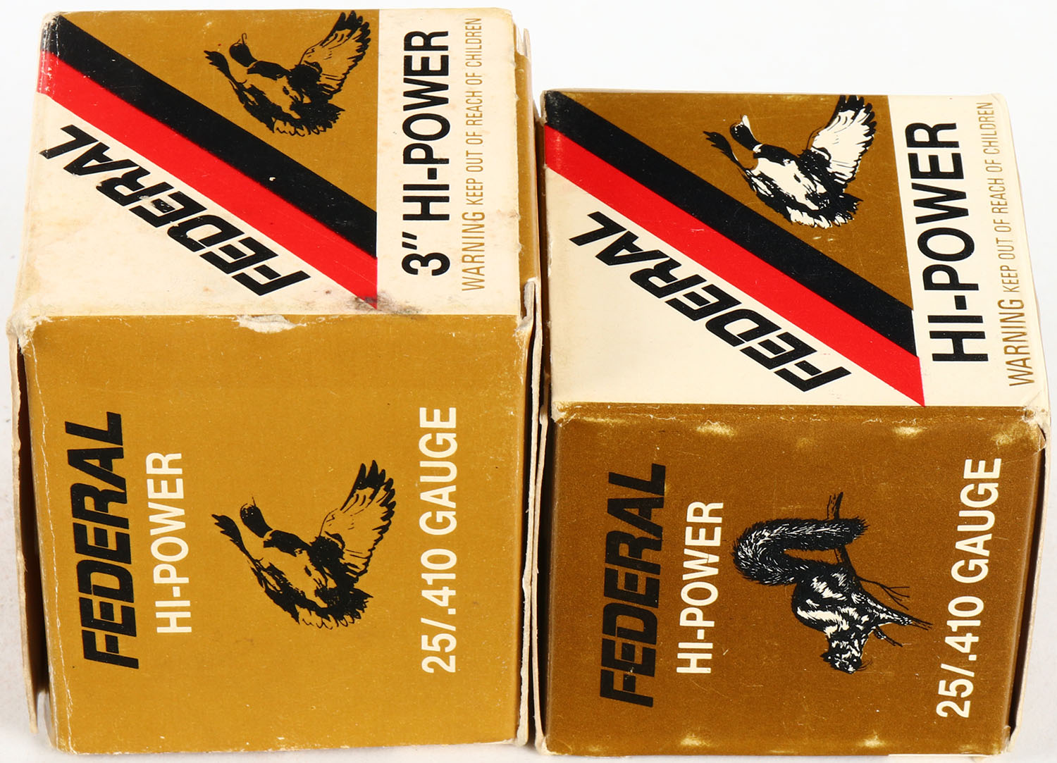 Lot of 2 Federal, 410ga., 1pc., Appears full, shot size 4 & 7 1/2, multi-colored box. Grade: Excellent - Value: 10 to 40