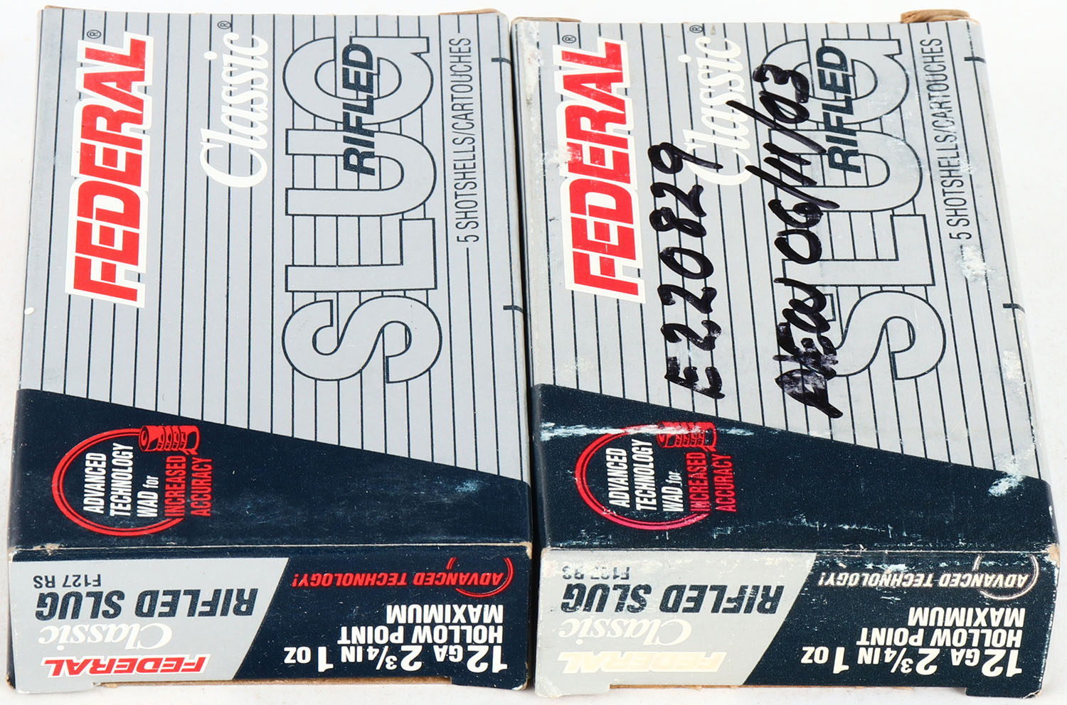 Lot of 2 Federal, 12ga., 1pc., Appears full, shot size Rifled Slugs, multi-colored box. Grade: Excellent - Value: 6 to 30