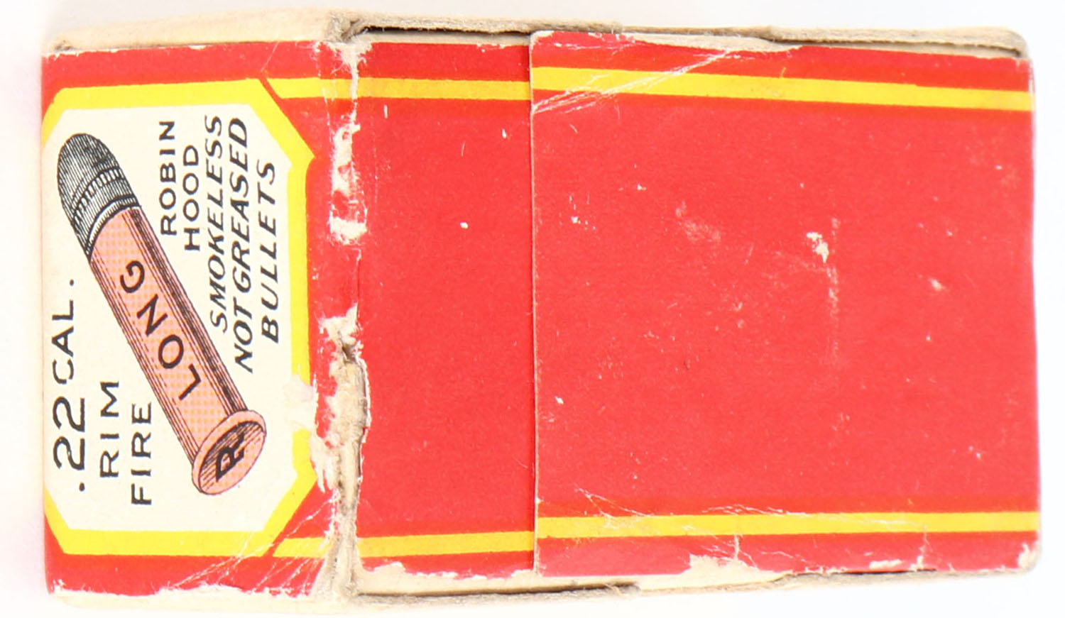 Robin Hood, Smokeless Rim Fire Cartridges, .22 Long, Not Greased, RHWeb: RHA-2 L-2, FULL & SEALED, 2pc. Buff box with red white & yellow wraparound label, box is solid with excellent color, very minor age soiling & shelf wear on bottom, very minor corner wear edges are mostly crisp, label is intact and has a partial tear on bottom right edge. Grade: Excellent + - Value: 1000 to 4000