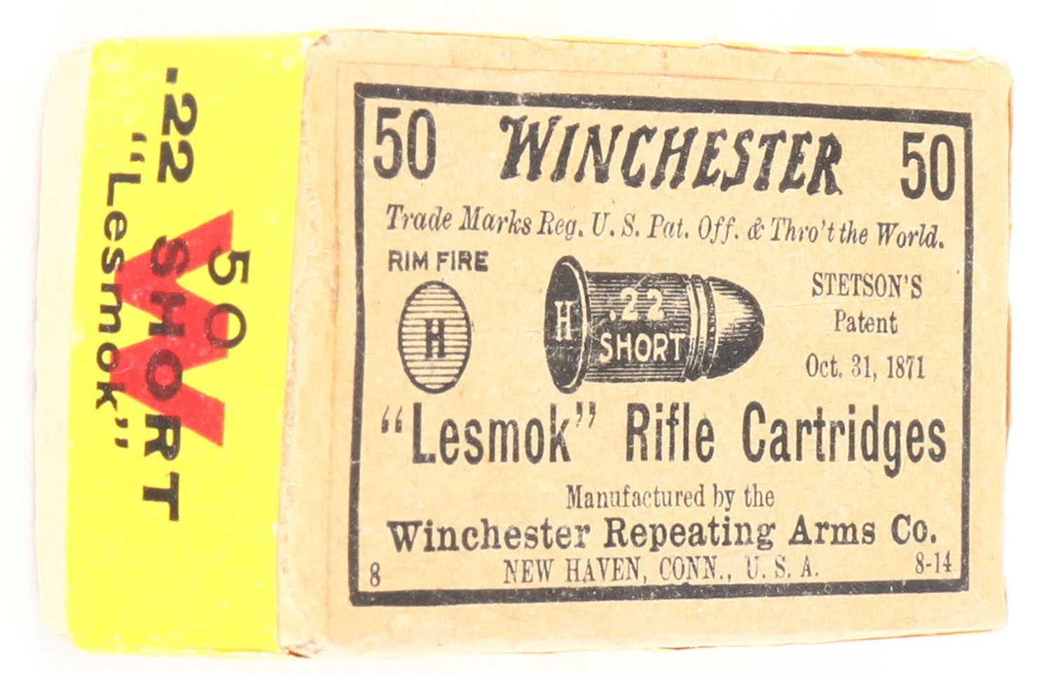 Winchester, ''Lesmok'' Rifle Cartridges, .22 Short, RR: WRA-69 S-38b, FULL & SEALED, 2pc. Buff box with buff top & yellow side sealing labels, box is solid with excellent color, appears to have had a seam split on top left edge that has been repaired very well, corners are mostly sharp, edges are crisp, labels are intact. Grade: Excellent - Value: 50 to 200