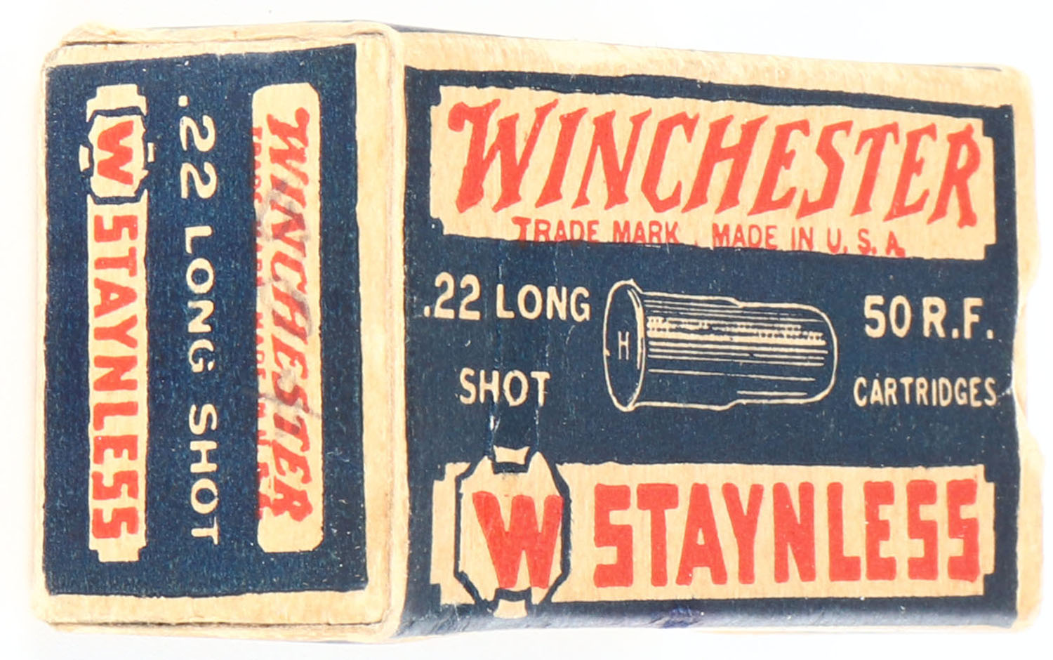 Winchester, Staynless, .22 Long Shot, RHWeb: WRA-12B L-3Bc, Partial 20rds., 1pc. Blue white & red box, box is solid with very good to excellent color, minor age soiling & corner wear, very minor edge wear, end flaps are solid, ammo is excellent. Grade: Excellent - Value: 40 to 120