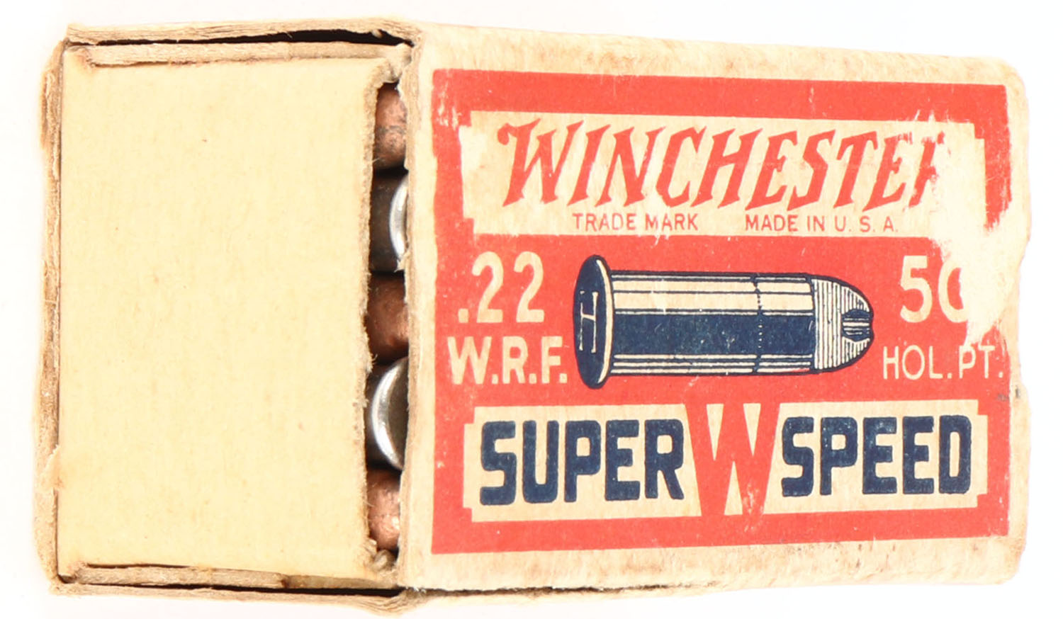 Winchester, Super Speed, .22 W.R.F. Hollow Point, RHWeb: WRA-13 WRF-4d, Partial 47rds. 1pc. Red buff & blue box, box is missing left end flap, partial seam split to top front edge, scuffing to top, corner wear, edge wear, right end flap is solid, ammo is excellent. Grade: Good + - Value: 20 to 80
