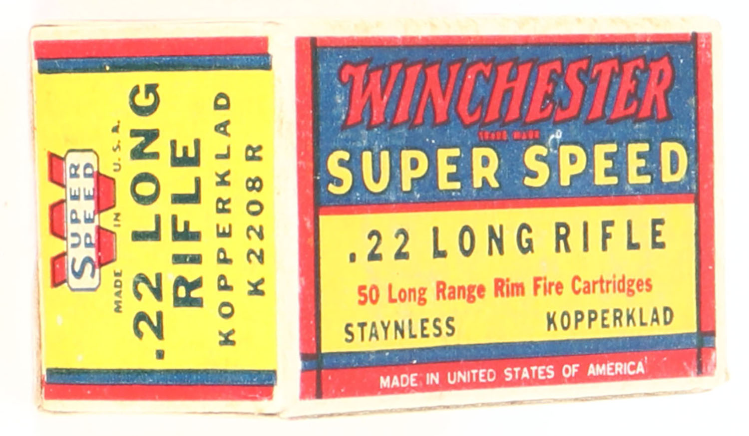Winchester, Super Speed, .22 Long Rifle, Staynless Kopperklad, RHWeb: WRA-15 LR-1b, Full, 1pc. Yellow blue & red box, box is solid with excellent color, very minor edge & corner wear, end flaps are solid, ammo is excellent. Grade: Excellent + - Value: 10 to 40