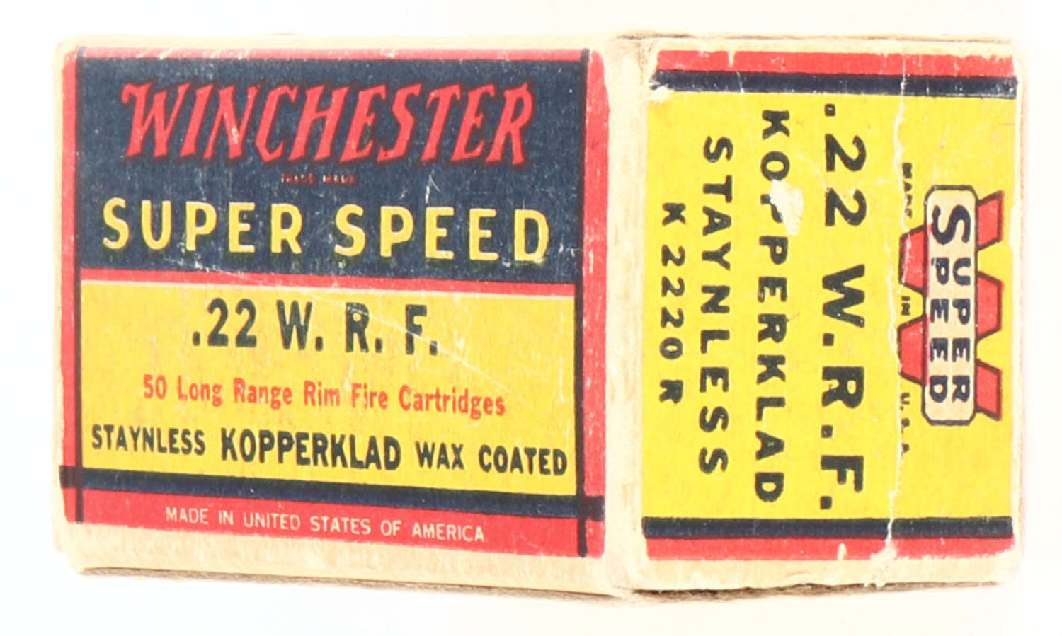 Winchester, Super Speed, .22 W.R.F., Staynless Kopperklad Wax Coated, RHWeb: WRA-15 WRF-1b, Full, 1pc. Yellow blue & red box, box is solid with very good to excellent color, some age soiling & corner wear, minor edge wear, end flaps are solid, ammo is excellent. Grade: Very Good ++ - Value: 20 to 80
