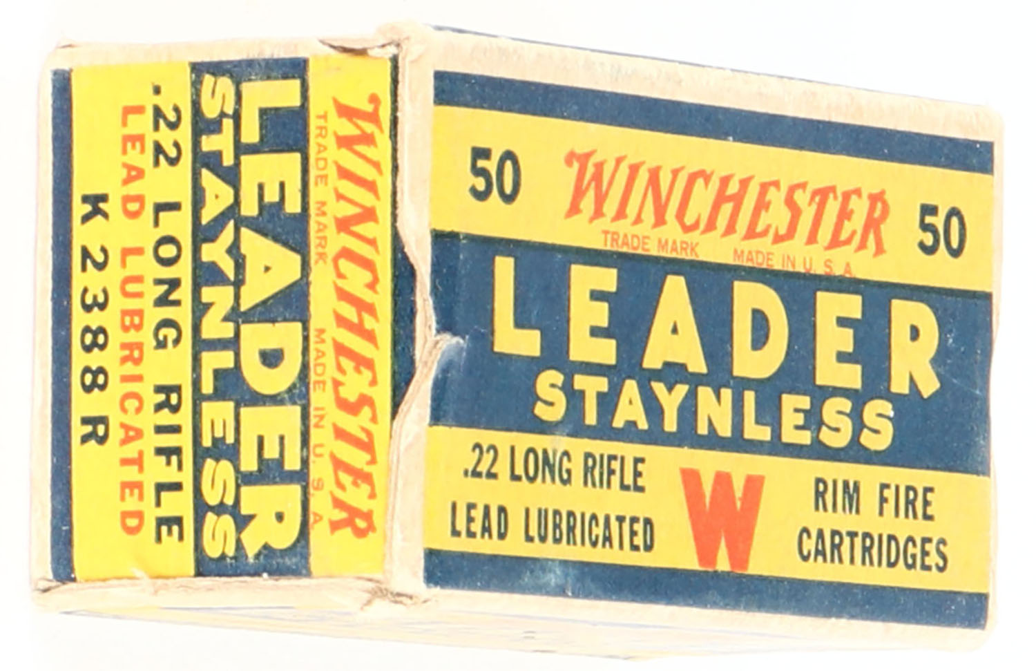 Winchester, Leader Staynless, .22 Long Rifle, RHWeb: WRA-55 LR-1a, Full, 1pc. Yellow blue & red box, box is solid with very good color, some age soiling & corner wear, very minor edge wear, end flaps are solid, ammo is very good. Grade: Excellent - Value: 20 to 60