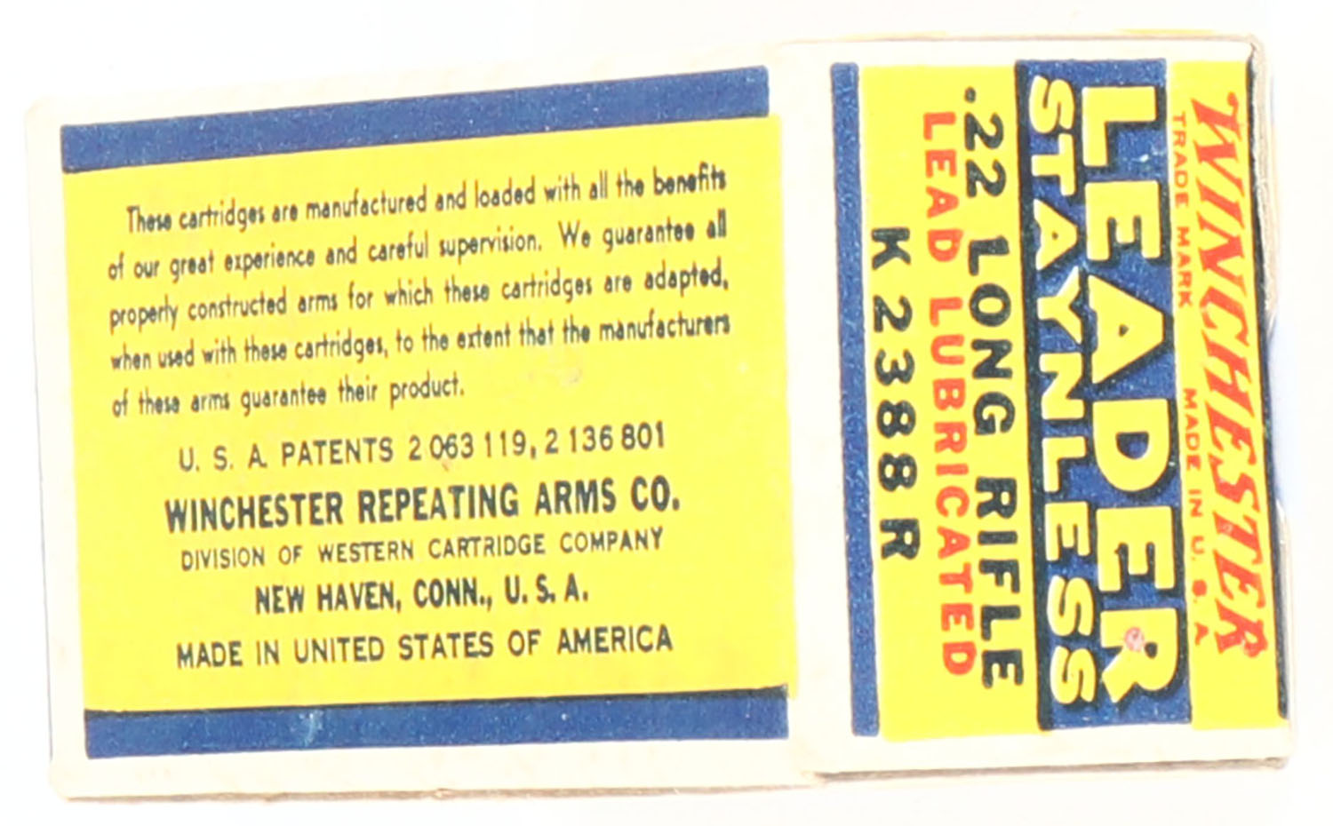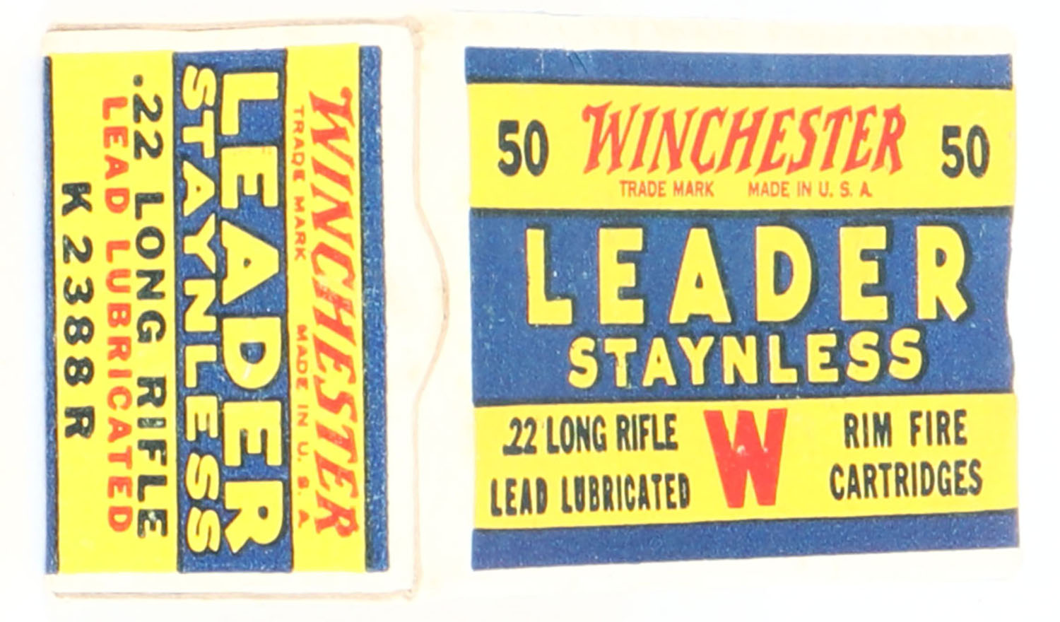 Winchester, Leader Staynless, .22 Long Rifle, RHWeb: WRA-55 LR-1c, Full, 1pc. Yellow blue & red box, box is MINT with minty color, corners are sharp, edges are crisp, end flaps are solid, ammo is excellent. Grade: MINT - Value: 30 to 90