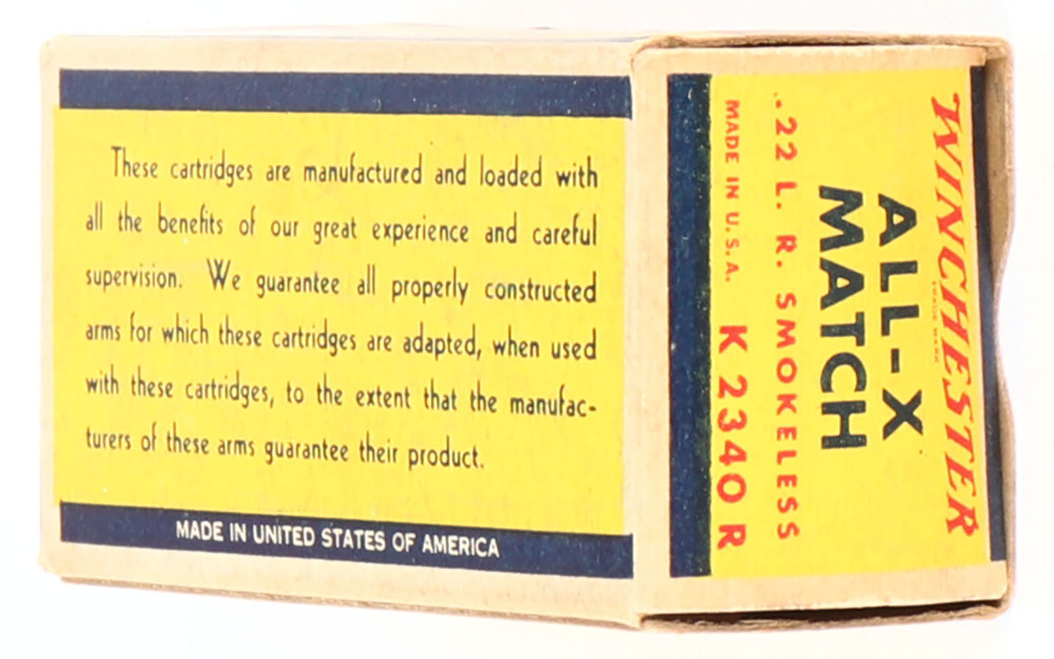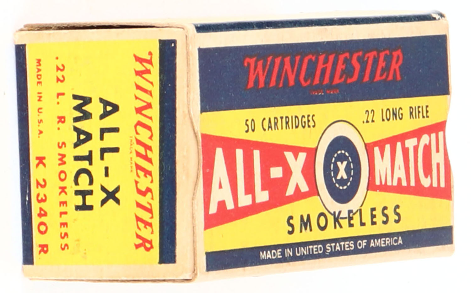 Winchester, All-X Match, .22 Long Rifle, RHWeb: WRA-54 LR-9, Full, 1pc. Yellow red & blue box, box is solid with excellent color, minor age soiling, very minor corner wear, edges are crisp, end flaps are solid, ammo is excellent. Grade: Excellent + - Value: 100 to 200