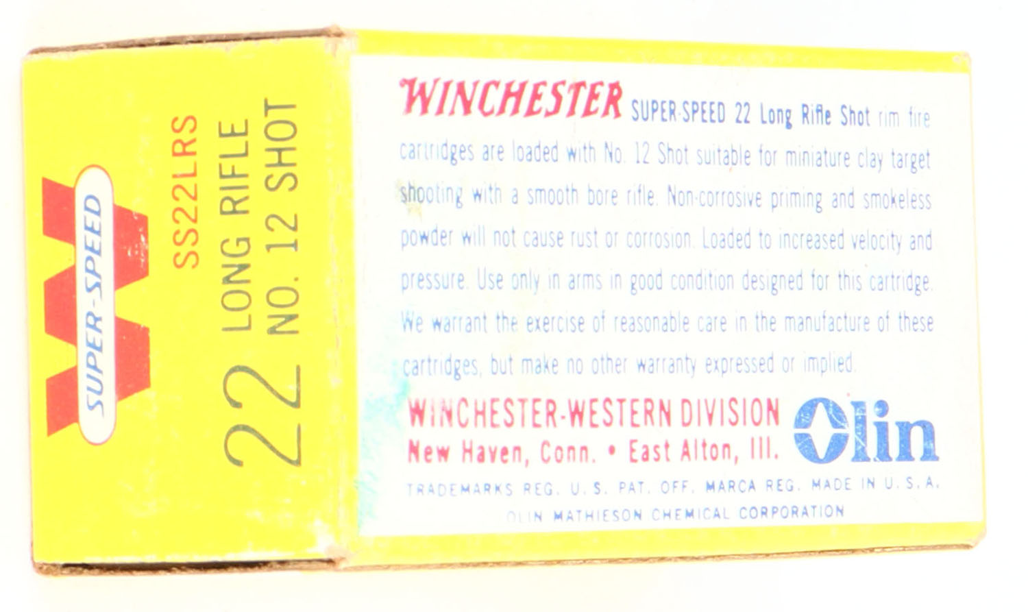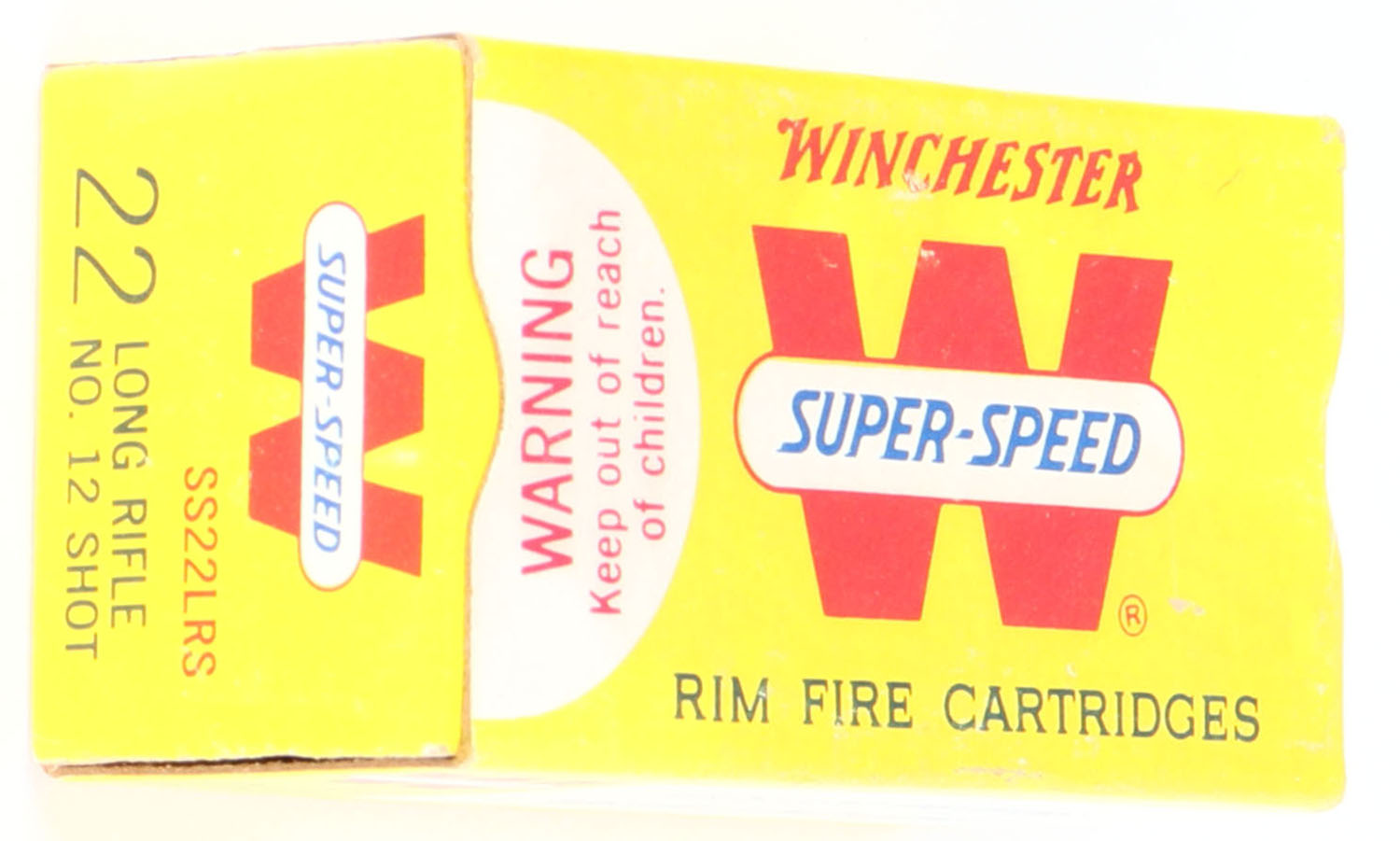 Winchester, Super-Speed, .22 Long Rifle Shot, RHWeb: WRA-20 LR-6, Full, 1pc. Yellow white & red box, box is solid with very good to excellent color, minor age soiling, corners are mostly sharp, edges are crisp, end flaps are solid, ammo is minty. Grade: Excellent + - Value: 10 to 40