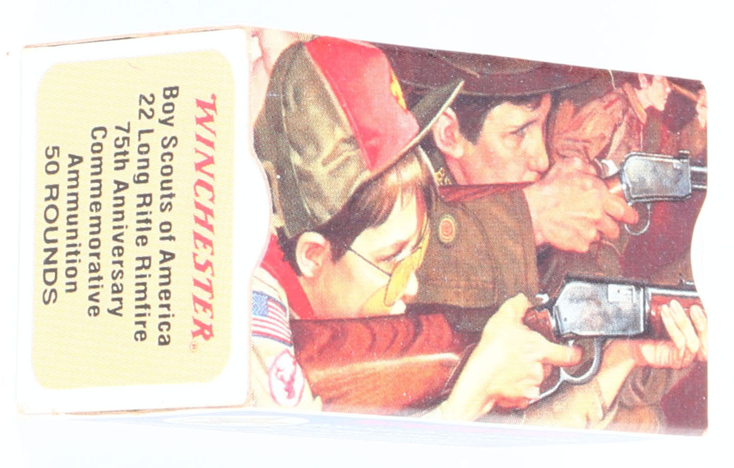 Winchester, Boy Scouts of America 75th Anniversary, .22 Long Rifle, RHWeb: WRA-70 LR-1, Full, 1pc. Multicolored box, box is mint with minty color, sharp corners, crisp edges, rigid end flaps, ammo is minty. Grade: MINT - Value: 10 to 50