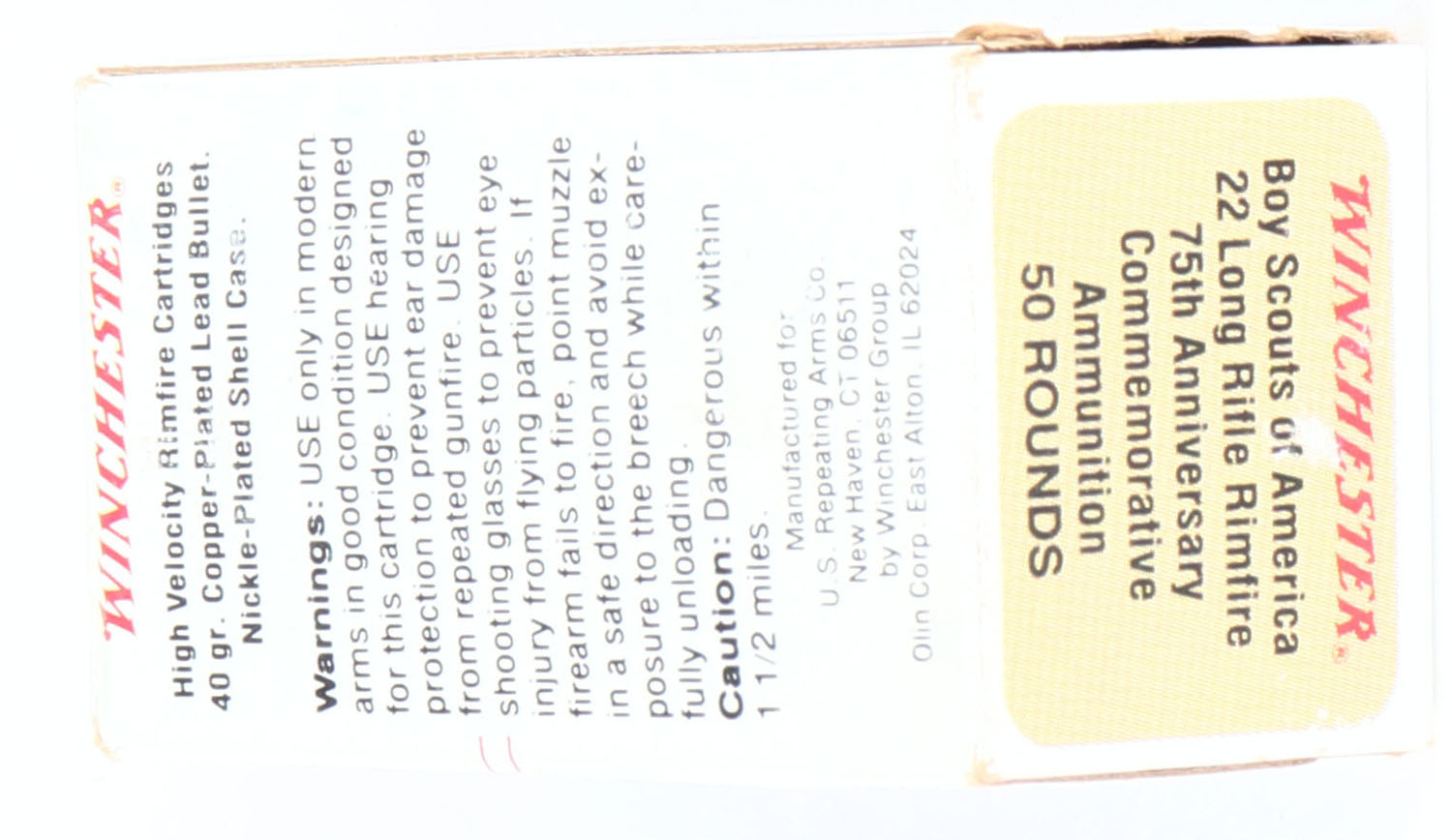 Winchester, Boy Scouts of America 75th Anniversary, .22 Long Rifle, RHWeb: WRA-70 LR-1, Full, 1pc. Multicolored box, box is near mint with minty color, only one very small scuff on top, sharp corners, crisp edges, rigid end flaps, ammo is minty. Grade: Excellent ++ - Value: 10 to 50