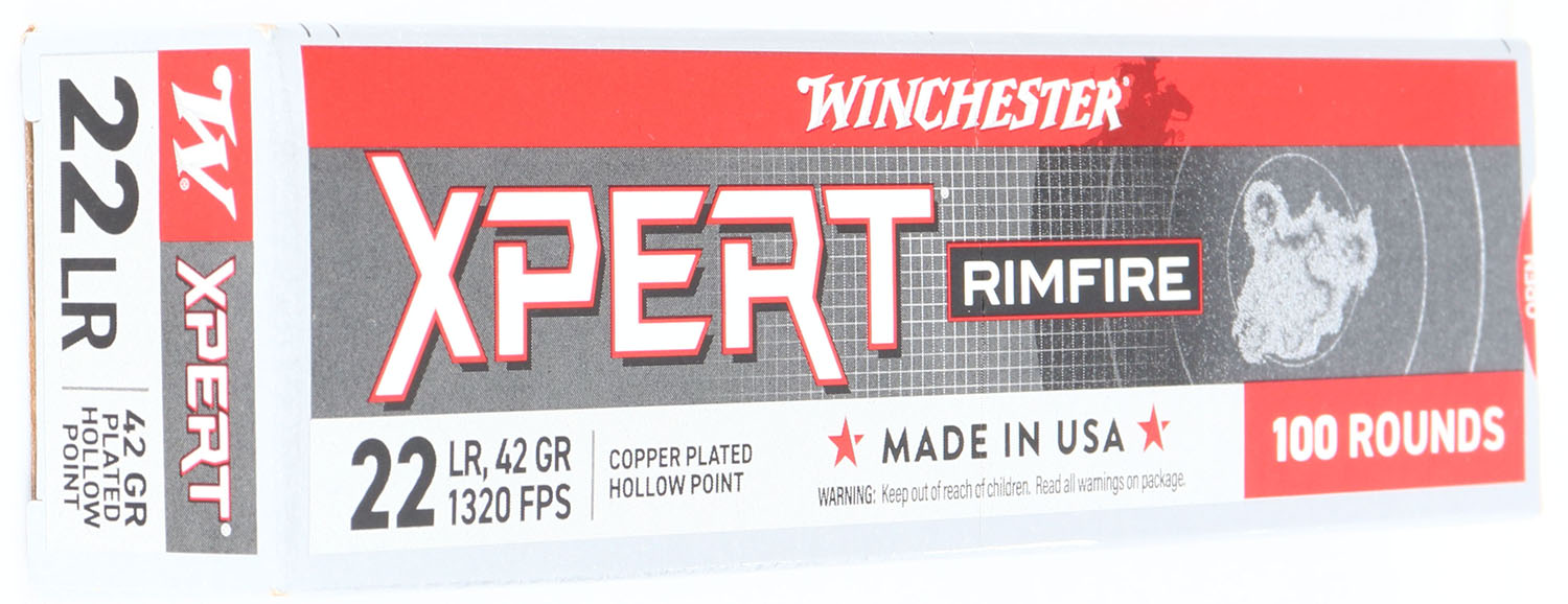 Winchester, Xpert, .22 Long Rifle, 42 Grain Copper Plated Hollow Point, 1320 FPS, Full, 100rds., 1pc. Gray red & white box, box is MINT with minty color, corners are sharp, edges are crisp, end flaps are solid, ammo is mint. Grade: MINT - Value: 10 to 50