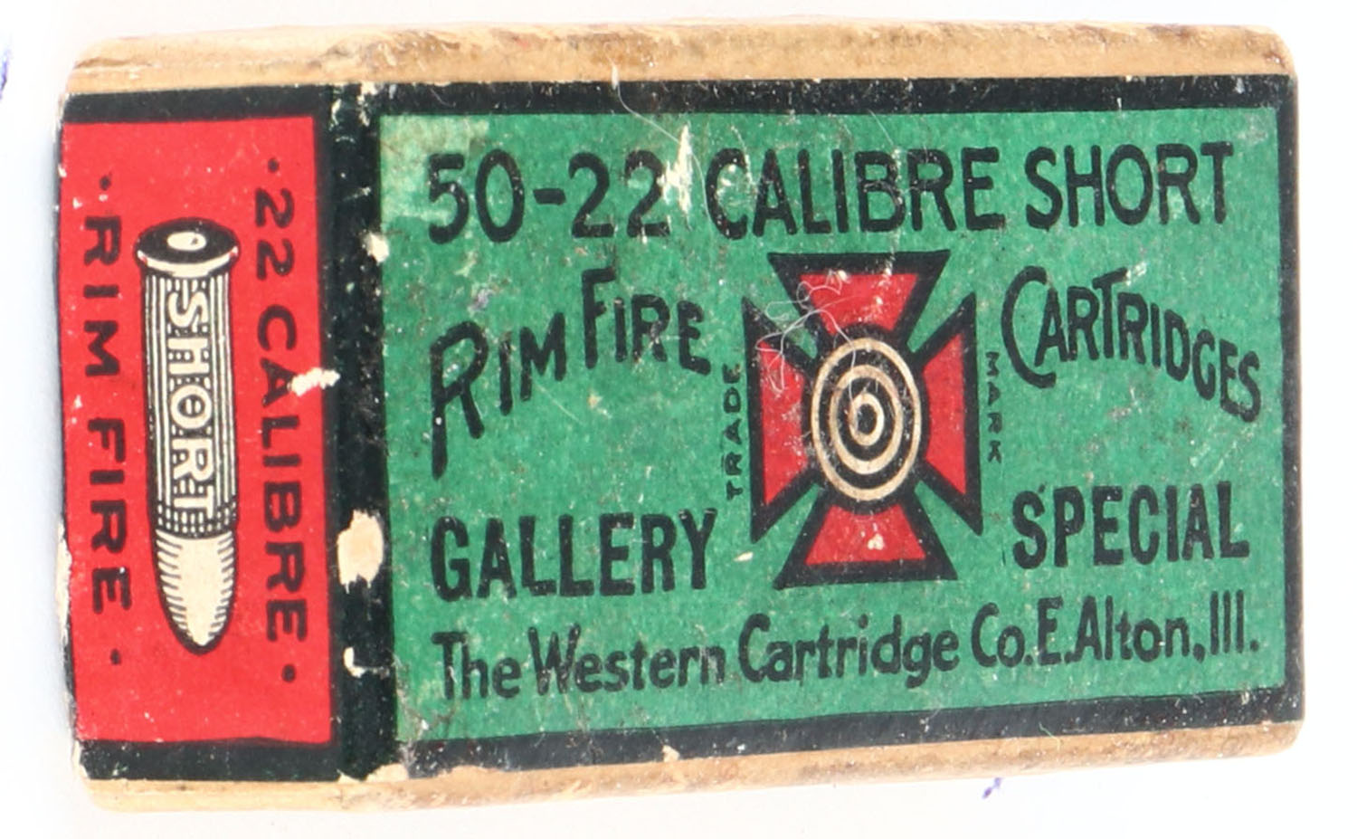 Western, Rim Fire Cartridges, .22 Short, Gallery Special, HAS U.C.C. Co. logo, RHWeb: WCC-48 S-1, Full, 2pc. Buff box with green red & black wraparound label, box is solid with very good to excellent color, minor age soiling, some shelf wear, very minor edge & corner wear, label is intact, ammo is fair. Grade: Very Good ++ - Value: 200 to 1000