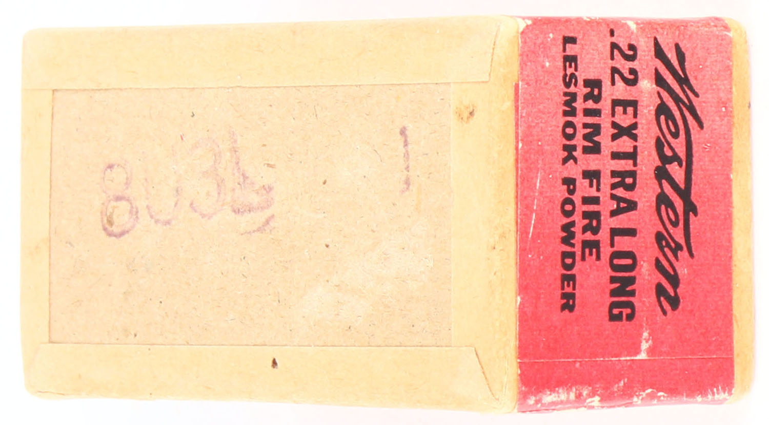Western, Rim Fire Cartridges, .22 Extra Long, Lesmok Powder, RHWeb: WCC-3 XL-1a, FULL & SEALED, 2pc. Buff box with green top & red side sealing labels, box is solid with excellent color, very minor age soiling & color fading to front, very minor edge & corner wear, labels are intact. Grade: Excellent + - Value: 200 to 1000