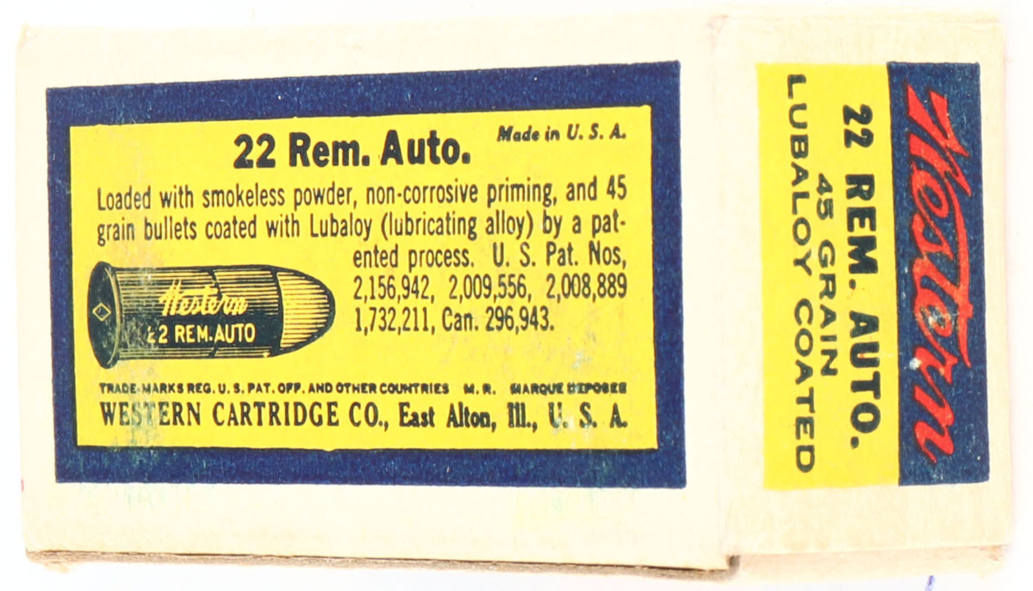 Western, Lubaloy, .22 Rem. Auto., Smokeless, RHWeb: WCC-4.4 RA-1e, Full, 1pc. Blue yellow & red bulls eye box, box is solid with excellent color, minor shelf & corner wear, edges are mostly crisp, end flaps are solid, ammo is excellent. Grade: Excellent - Value: 100 to 200