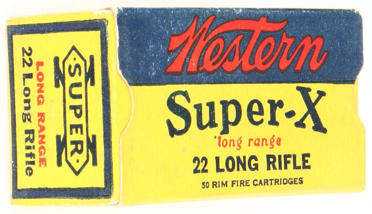 Western, Super-X, .22 Long Rifle, Long Range, RHWeb: WCC-Super-X-3 LR-9, Full, 1pc. Yellow blue & red box, box is solid with very good to excellent color, very minor age soiling, corners are mostly sharp, edges are crisp, end flaps are solid, ammo is excellent. Grade: Excellent + - Value: 8 to 40