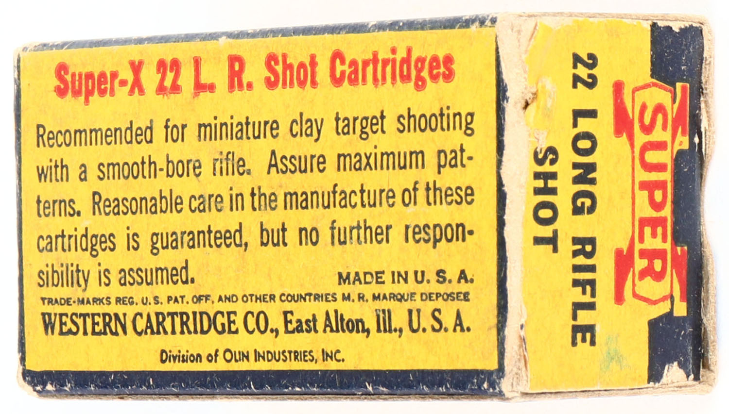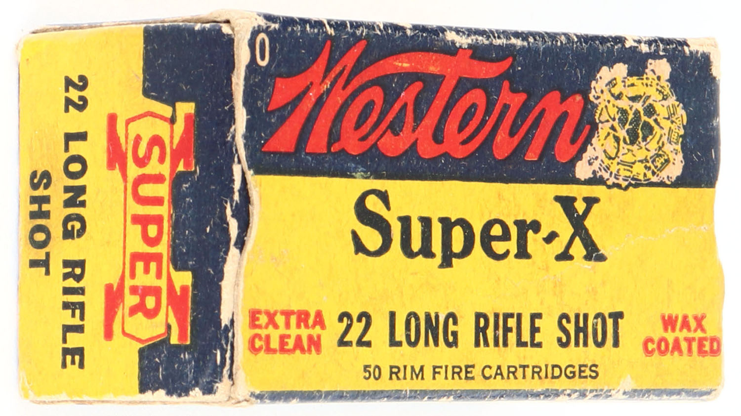 Western, Super-X, .22 Long Rifle Shot, RHWeb: WCC-Super-X Long Rifle-46 LRS-14, Full, 1pc. Yellow blue & red box, box is solid with very good color, some age soiling, edge & corner wear, end flaps are solid, ammo is excellent. Grade: Very Good + - Value: 10 to 50