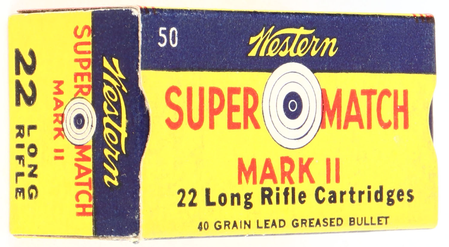 Western, Super Match Mark II, .22 Long Rifle, RHWeb: WCC-51.2 LR-3g, Full, 1pc. Yellow blue & red box, box is MINT with minty color, corners are sharp, edges are crisp, end flaps are solid, ammo is excellent to minty. Grade: MINT - Value: 20 to 60