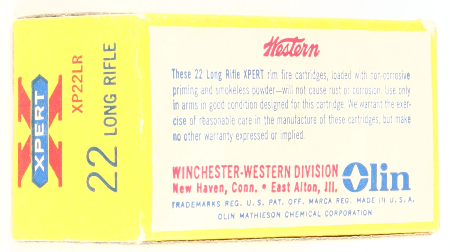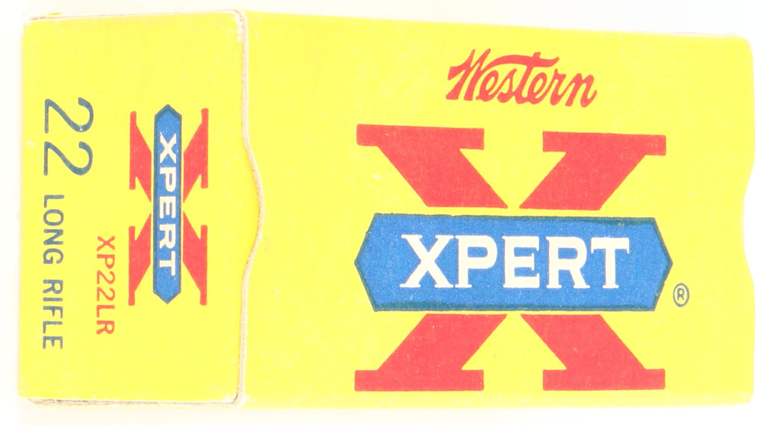 Western, Xpert, .22 Long Rifle, RHWeb: WCC-52 LR-2b, Full, 1pc. Yellow red & blue box, box is near mint with minty color, only very minor corner wear on few corners, most corners are sharp, edges are crisp, end flaps are solid, ammo is excellent. Grade: Excellent ++ - Value: 10 to 50
