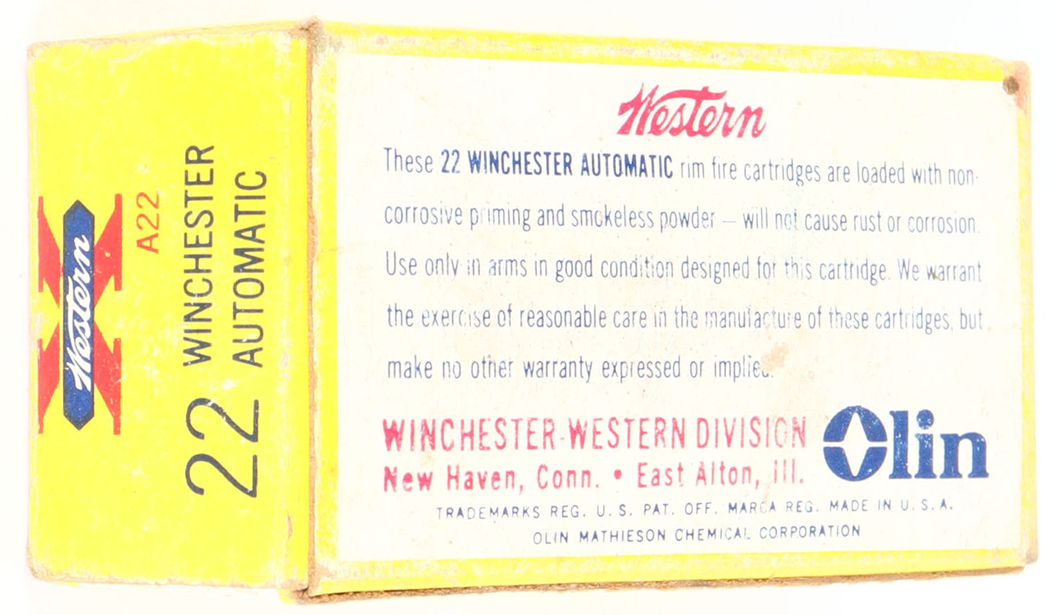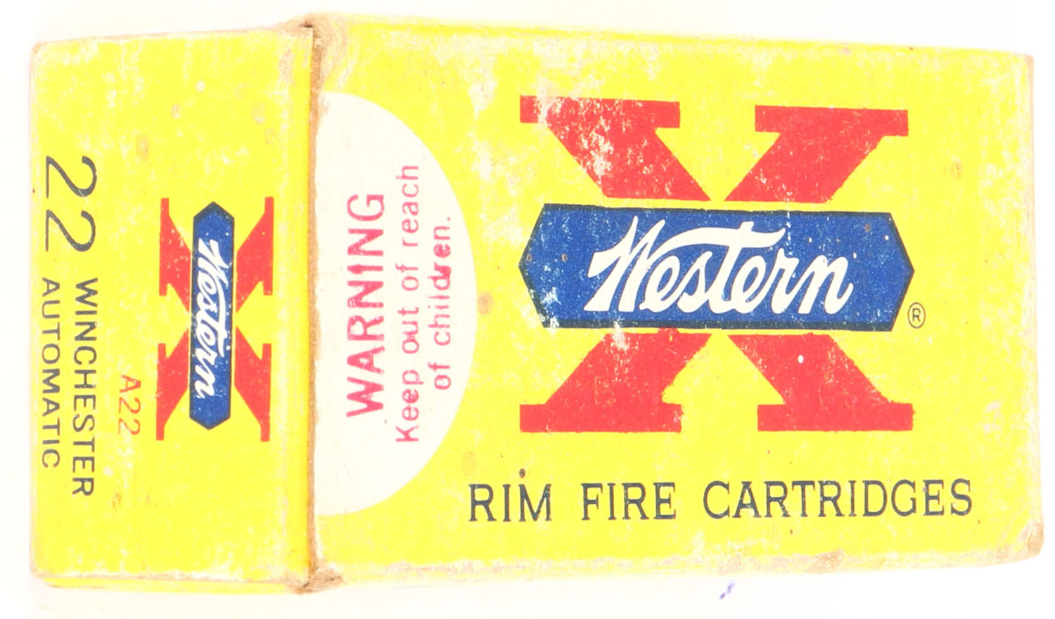 Western, X, .22 Winchester Automatic, 45 Gr. Lubaloy Coated Bullet, RHWeb: WCC-12 WA-1a, Full, 1pc. Yellow white & red box, box is solid with very good color, some shelf & corner wear, some edge wear, end flaps are solid, ammo is minty. Grade: Very Good ++ - Value: 10 to 50