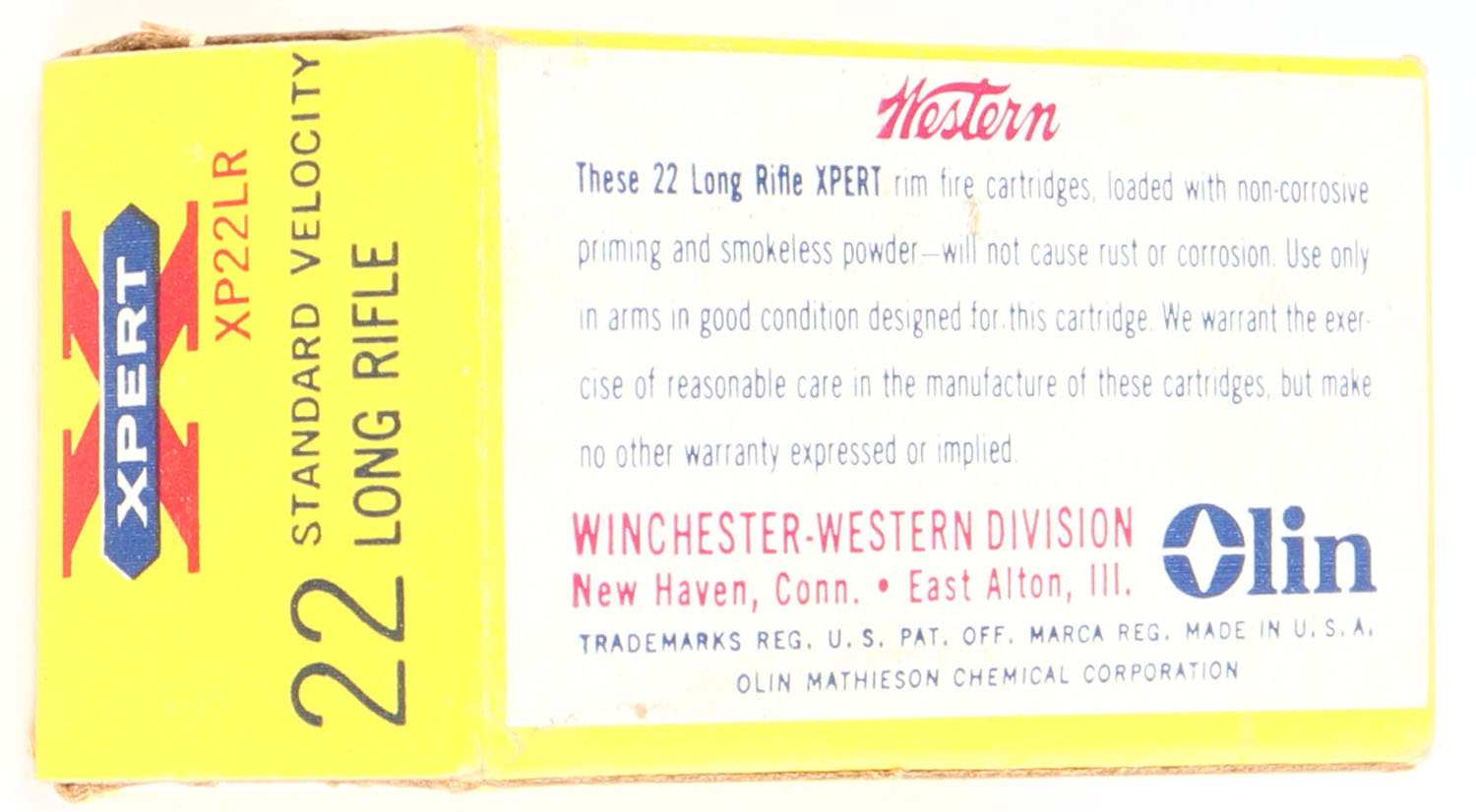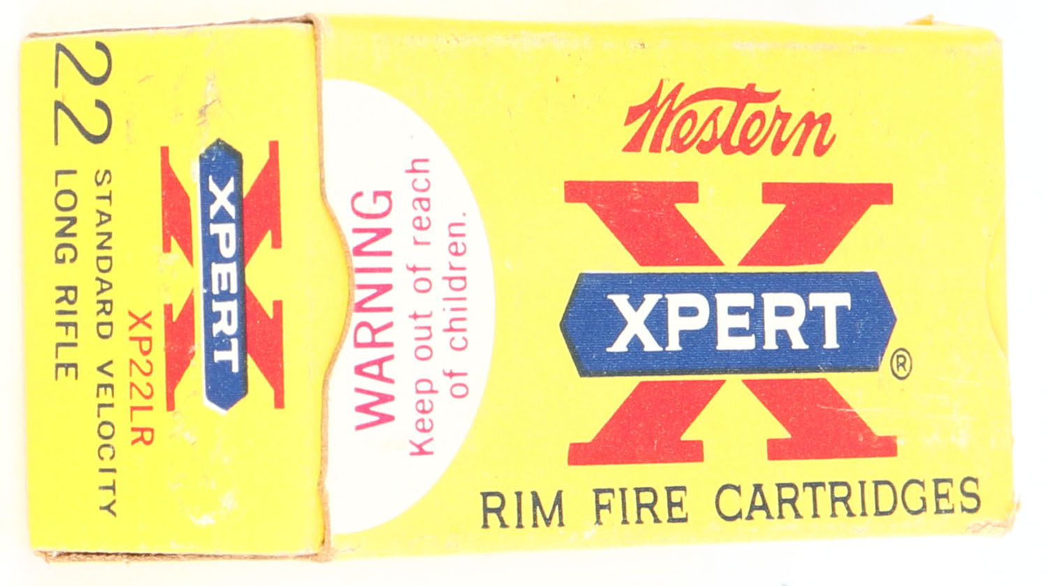 Western, Xpert, .22 Long Rifle, Standard Velocity, RHWeb: WCC-52 LR-3a, Full, 1pc. Yellow white & red box, box is solid with excellent color, minor corner wear, very minor edge wear, end flaps are solid, ammo is minty. Grade: Excellent + - Value: 6 to 30