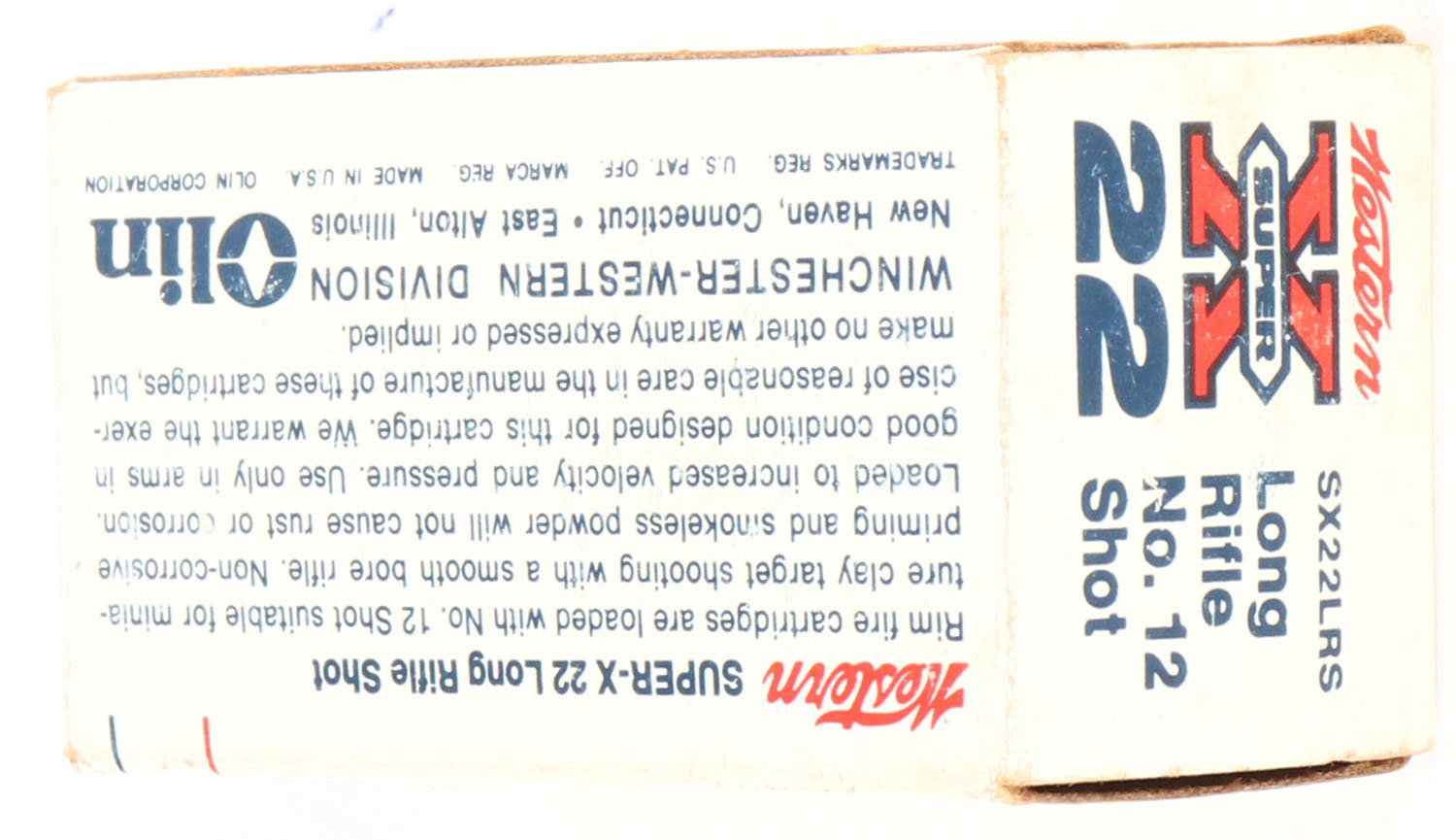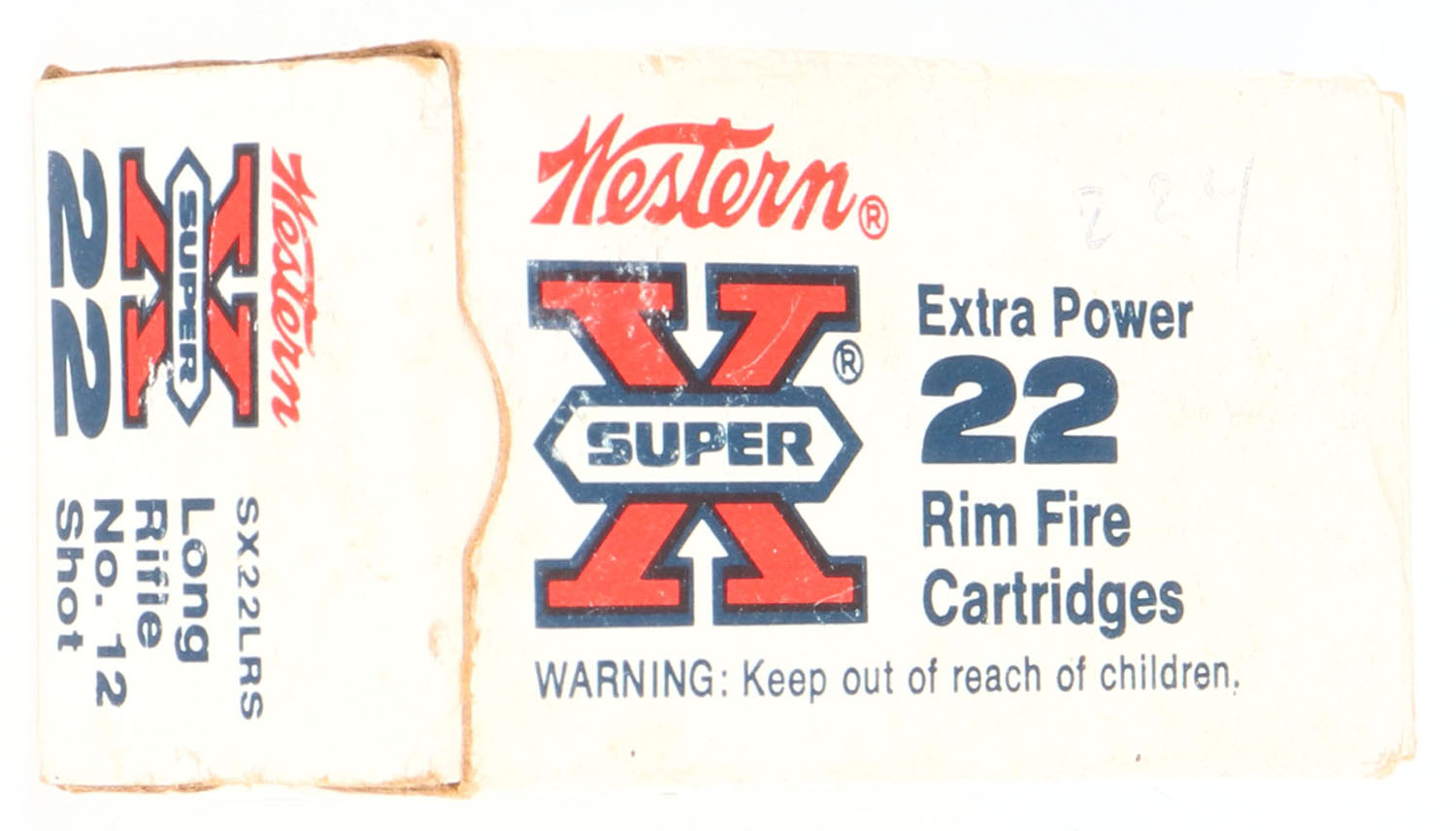 Western, Super X, .22 Long Rifle Shot, Extra Power, RHWeb: WCC-13 LH-7a, Partial 48rds., 1pc. White red & black box, box is solid with very good to excellent color, very minor age soiling & shelf wear, minor corner wear, edges are mostly crisp, top has been written on, end flaps are solid, ammo is excellent. Grade: Very Good ++ - Value: 8 to 40