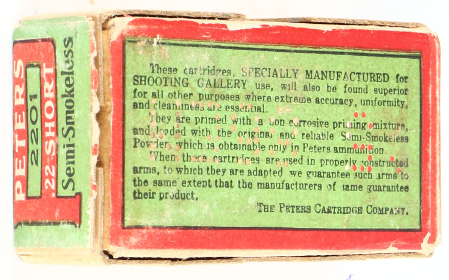 Peters, R.F. Rifle Cartridges, .22 Short, Semi-Smokeless Powder, RHWeb: PCC-5B S-1c, Full, 1pc. Buff box with green & red wraparound label, box is solid with very good to excellent color, some age soiling, very minor color fading, right end of lid has come unglued (not a seam split), very minor edge & corner wear, label is intact, ammo is excellent. Grade: Very Good + - Value: 30 to 120