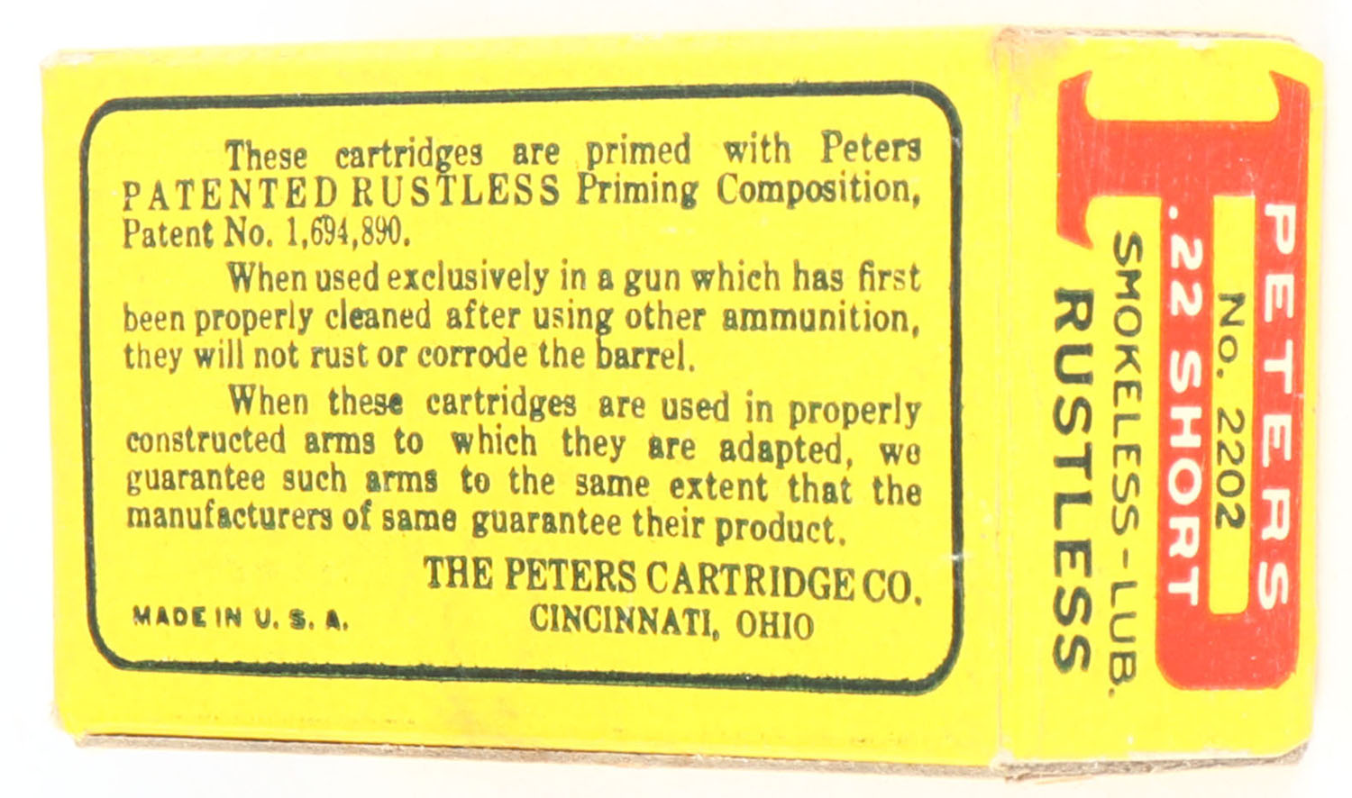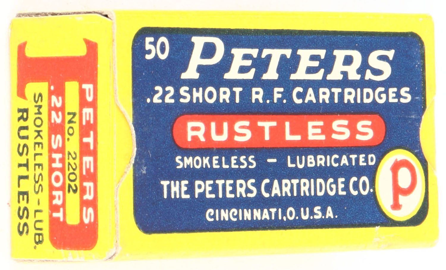 Peters, Rustless, .22 Short, Smokeless, RHWeb: PCC-8A S-4a, Full, 1pc. Blue yellow & red box, box is near mint with mint color, only has very minor edge wear on top front edge, edges are otherwise crisp, corners are mostly sharp, end flaps are solid, ammo is very good to excellent. Grade: Excellent ++ - Value: 30 to 90