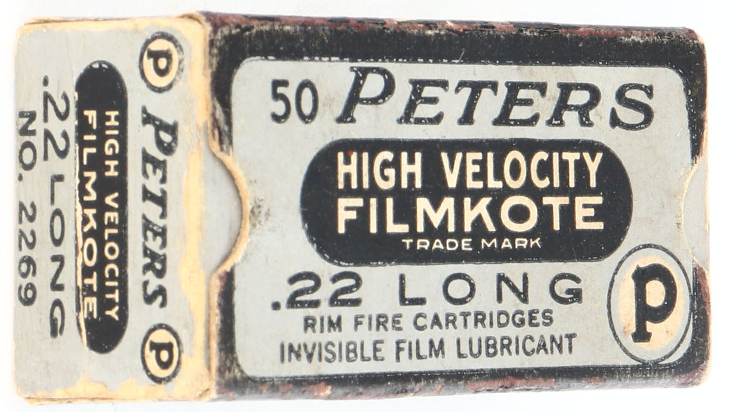 Peters, High Velocity Filmkote, .22 Long, RHWeb: PCC-13 L-1f, Full, 1pc. Silver & black box, box is solid with very good color, some age soiling, edge & corner wear, end flaps are solid, ammo is very good to excellent. Grade: Excellent - Value: 10 to 50