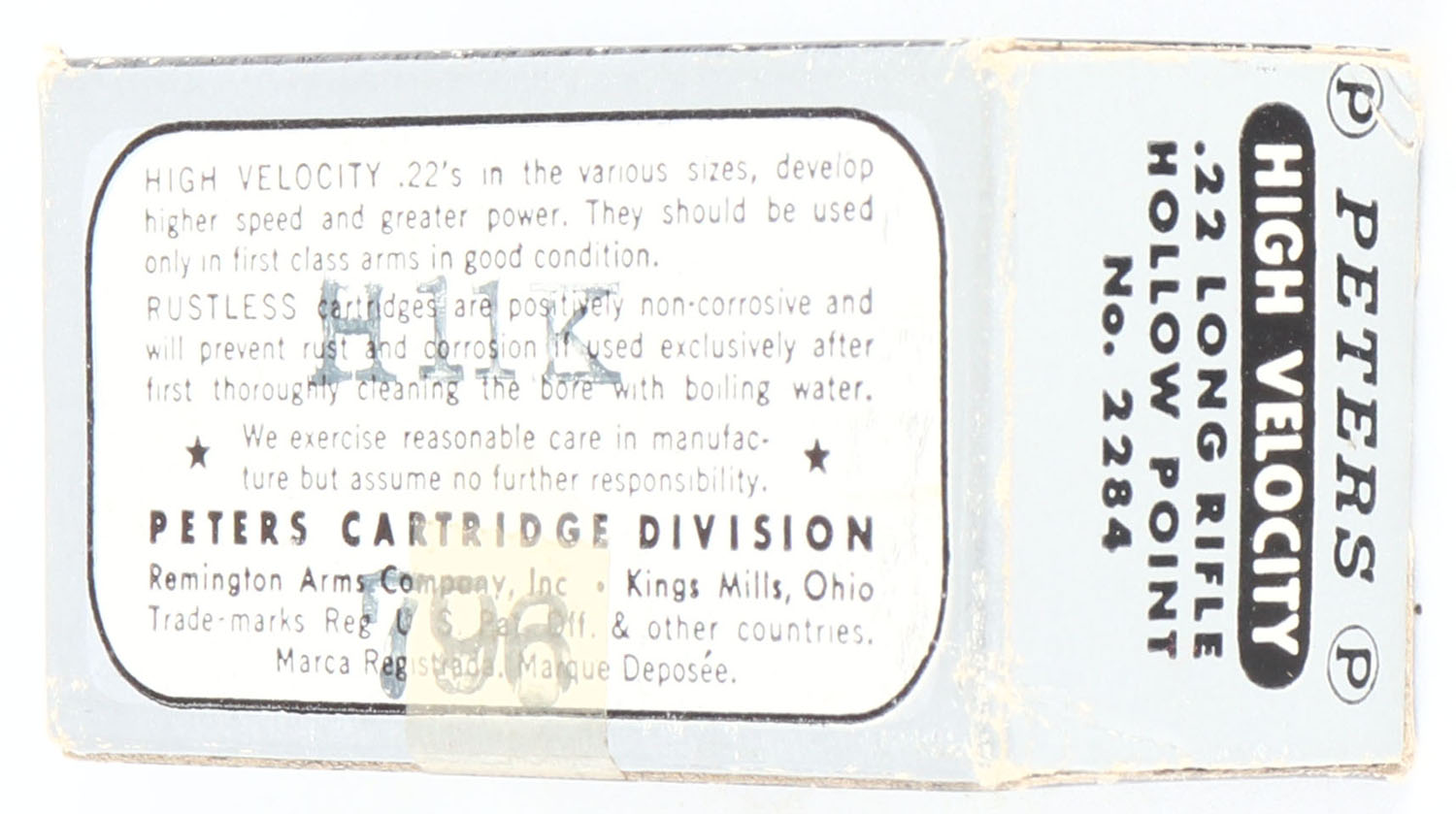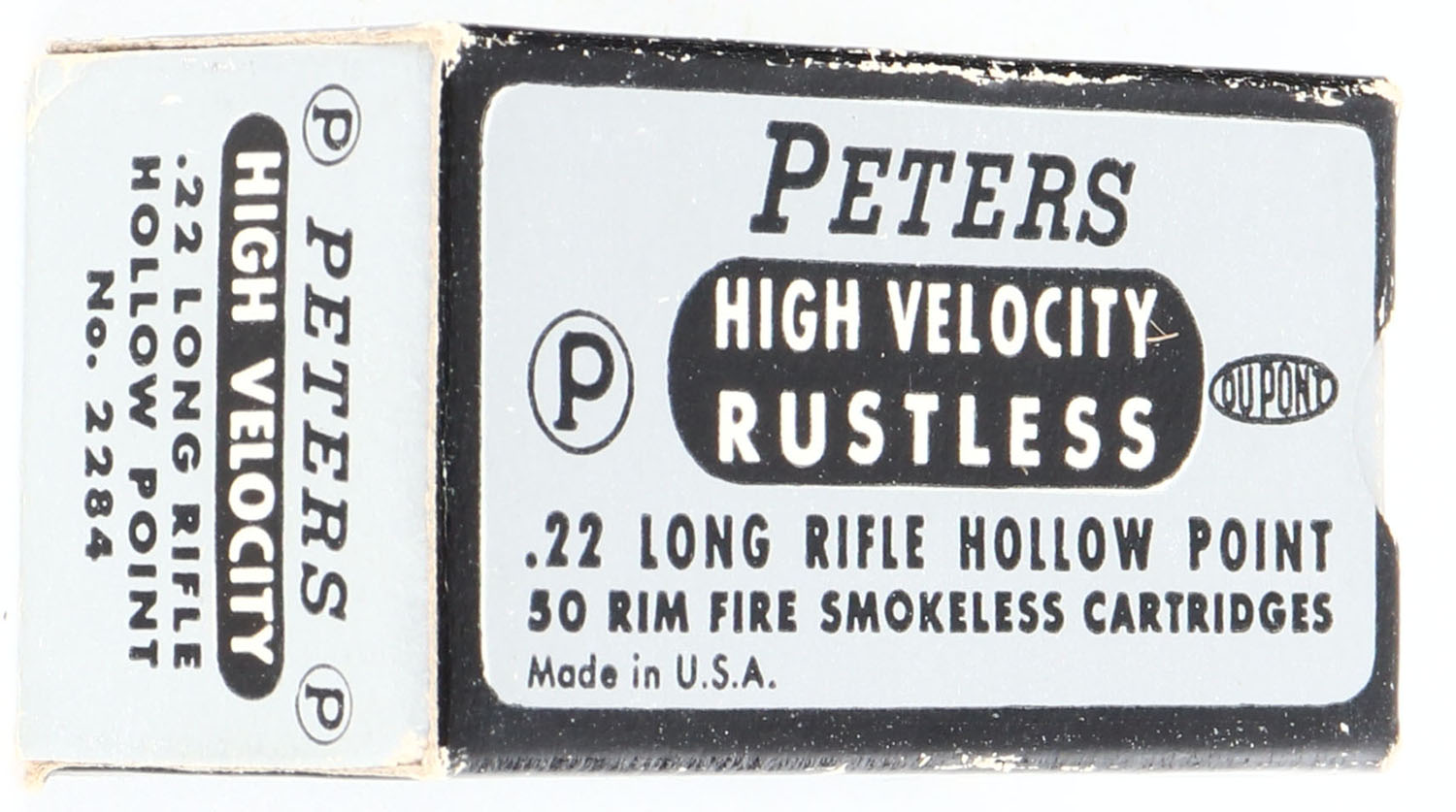 Peters, High Velocity Rustless, .22 Long Rifle Hollow Point, RHWeb: PCC-14 LR-2aa, Full, 1pc. Silver & black box, box is solid with excellent color, very minor edge & corner wear, end flaps are solid, ammo is excellent. Grade: Excellent - Value: 8 to 40
