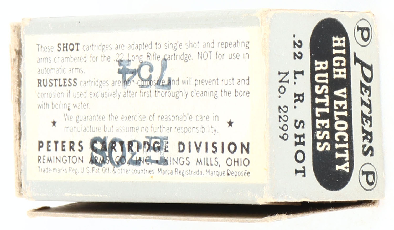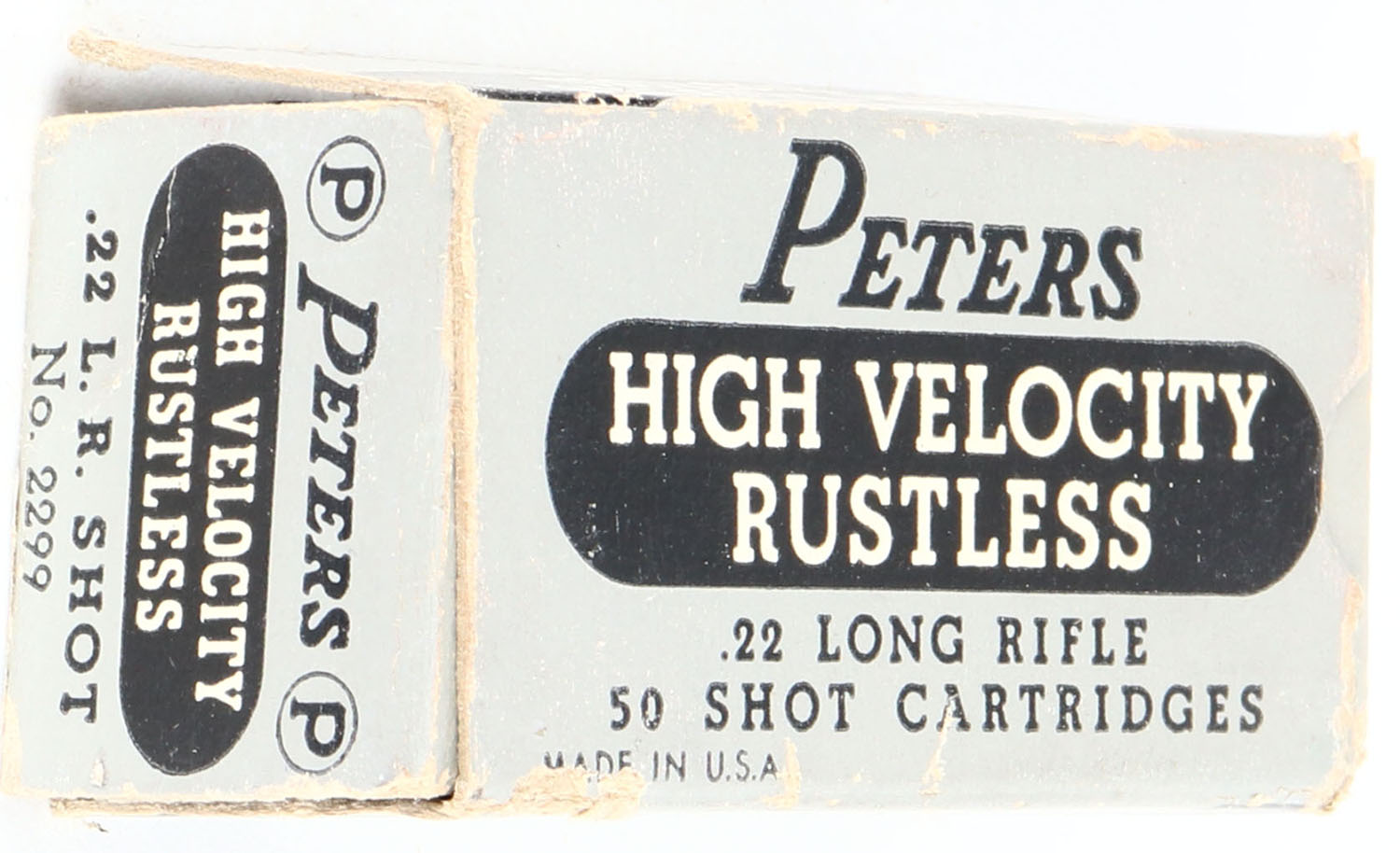 Peters, High Velocity Rustless, .22 Long Rifle Shot, RHWeb: PCC-14 LR-3, Full, 1pc. Silver black & white box, factory seam has unadhered, left end flap is torn, box has excellent color, edge & corner wear, right end flap is solid, ammo is excellent. Grade: Good ++ - Value: 10 to 50
