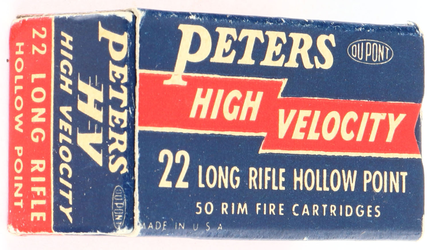 Peters, High Velocity, .22 Long Rifle Hollow Point, RHWeb: PCC-17 LR-3d, Full, 1pc. Blue red & white box, box is solid with excellent color, very minor corner wear, edges are crisp, end flaps are solid, ammo is excellent. Grade: Excellent + - Value: 10 to 40