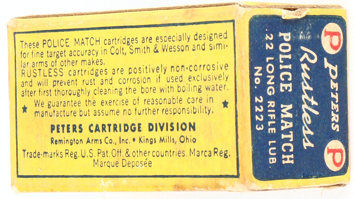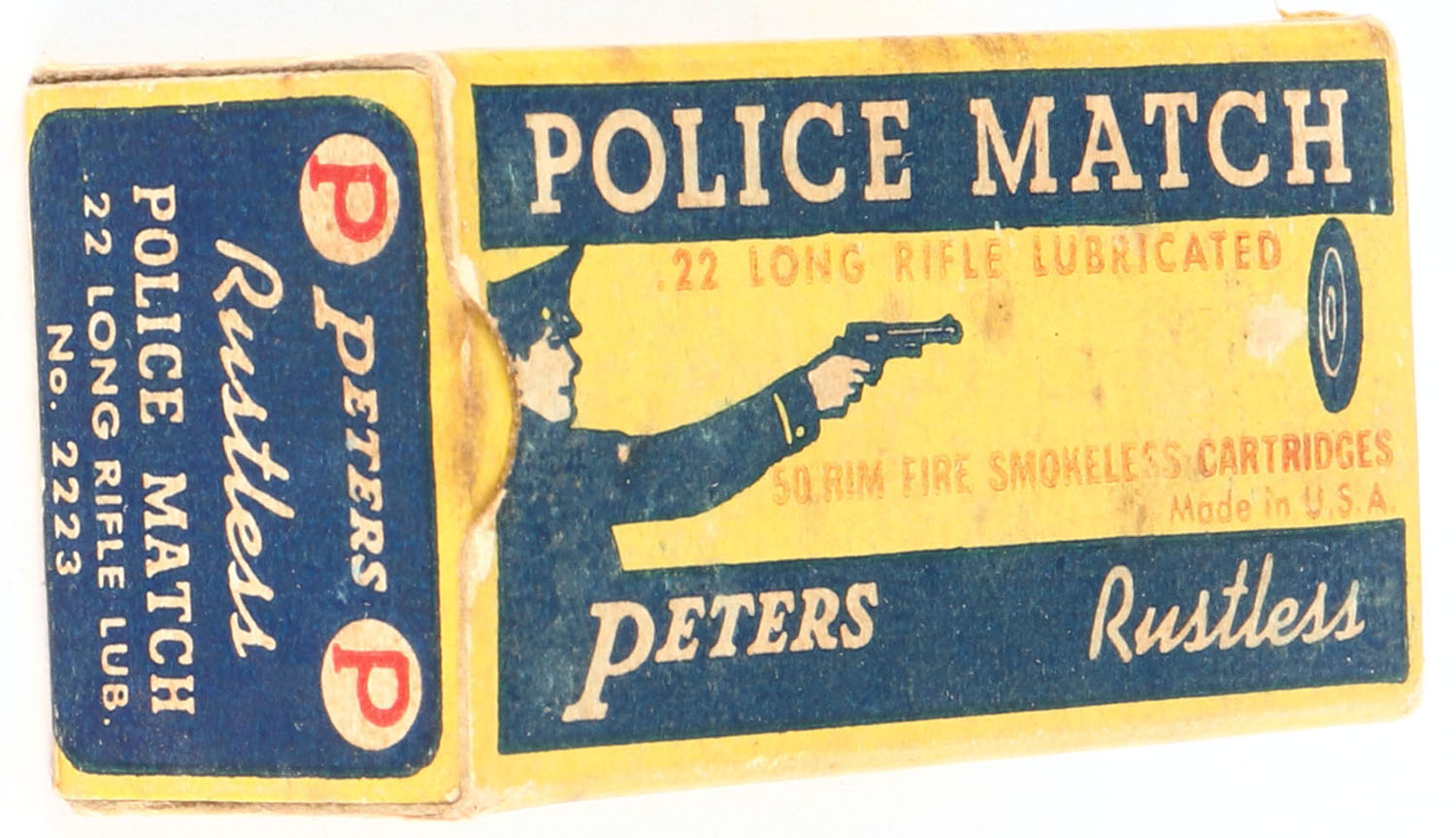Peters, Police Match, .22 Long Rifle, RHWeb: PCC-53C LR-1a, Full, 1pc. Yellow blue & white box, box is solid with good to very good color, some age soiling & color fading, very minor corner wear, edges are mostly crisp, end flaps are solid, ammo is excellent. Grade: Very Good + - Value: 30 to 90