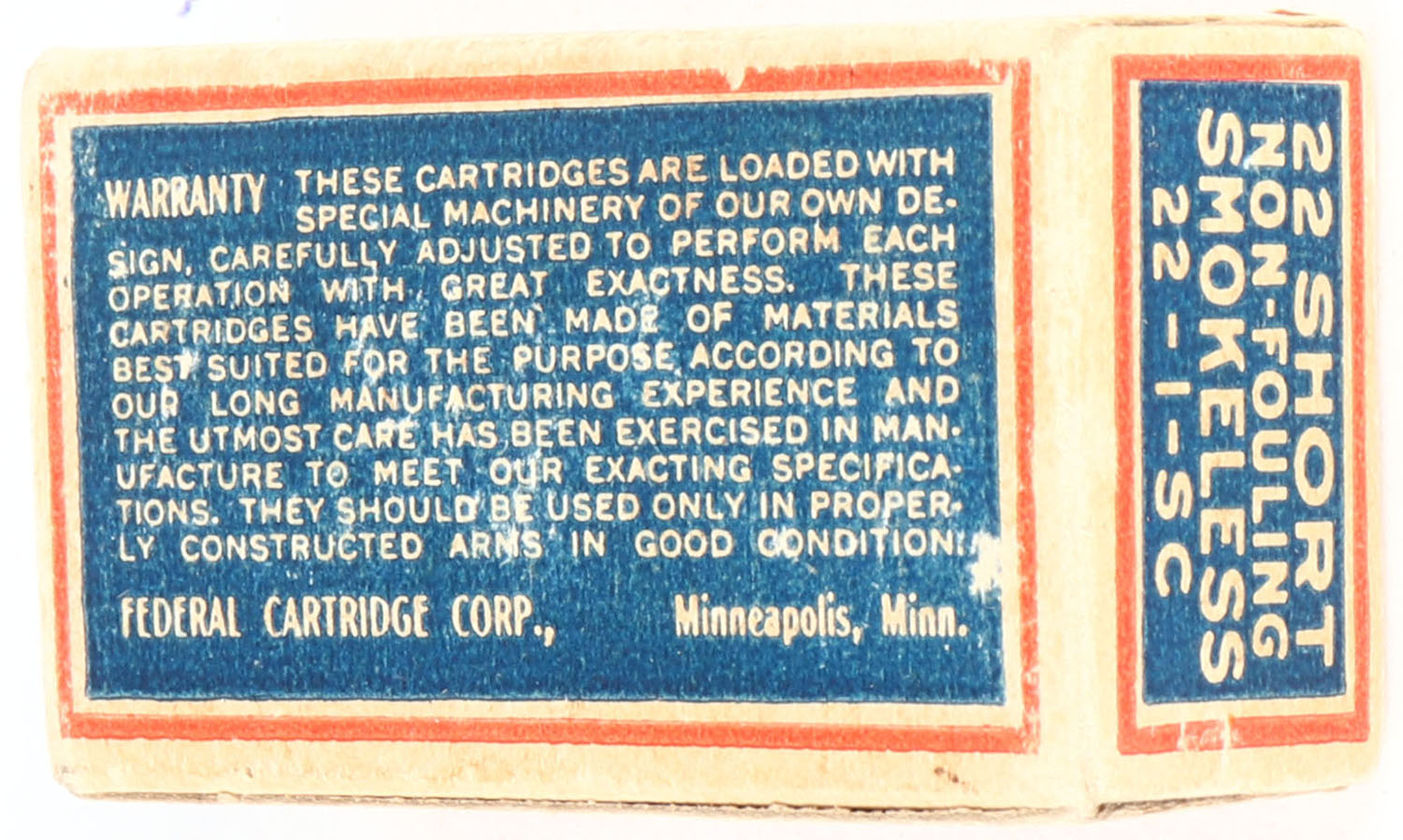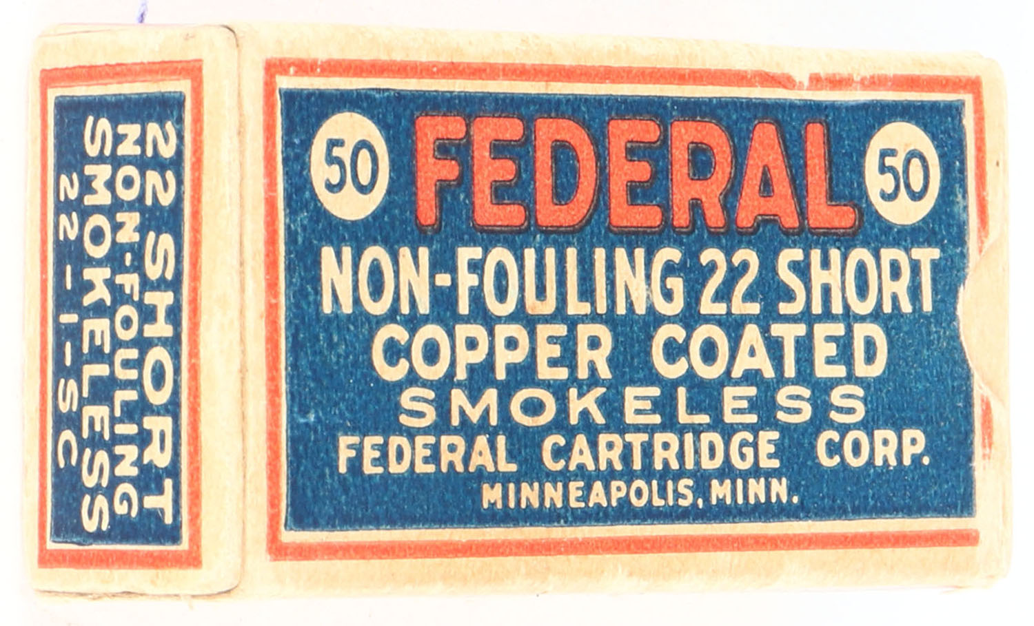 Federal, Non-Fouling, .22 Short, Copper Coated Smokeless, RHWeb: FCC-3 S-2c, Full, 1pc. Blue red & buff box, box is solid with very good to excellent color, some age soiling & corner wear, very minor edge wear, end flaps are solid, ammo is excellent. Grade: Very Good ++ - Value: 100 to 400