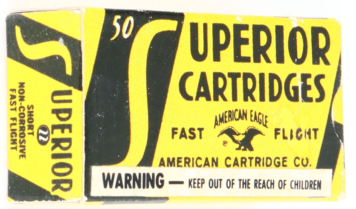 American, Superior Cartridges, .22 Short, Fast Flight, RHWeb: ACC-4 S-1a, Full, 1pc. Yellow & black box with white child warning over-label, box is solid with excellent to minty color, corners are sharp, edges are crisp, end flaps are solid, ammo is very good to excellent. Grade: Excellent ++ - Value: 30 to 90