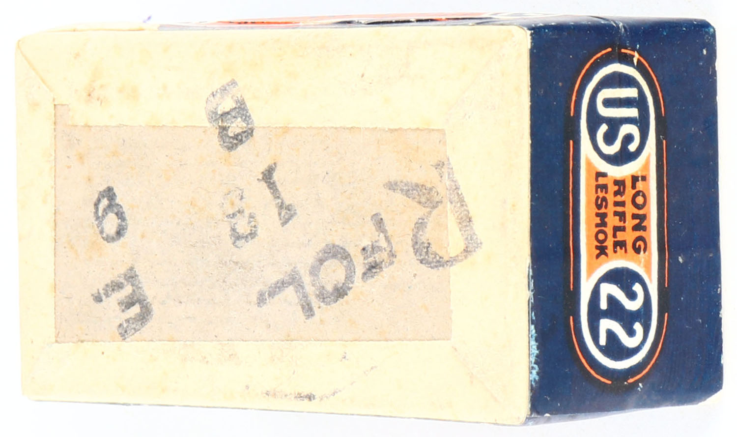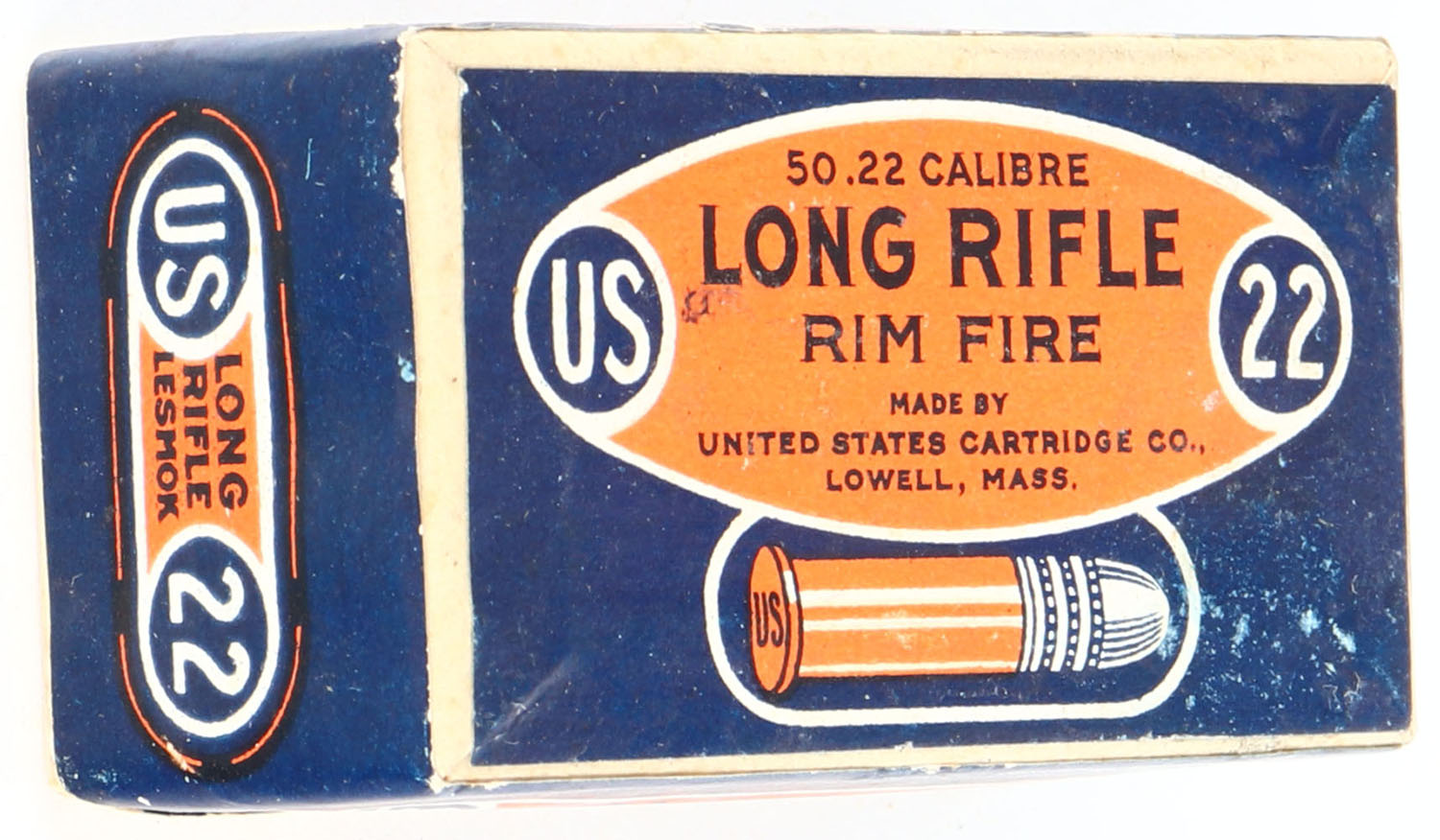 U.S., Lesmok Rim Fire, .22 Long Rifle, RHWeb: US-7 LR-1, FULL & SEALED, 2pc. Buff box with blue/orange top & side sealing labels, box is MINT with minty color, corners are sharp, edges are crisp, labels are intact. Grade: MINT - Value: 50 to 150