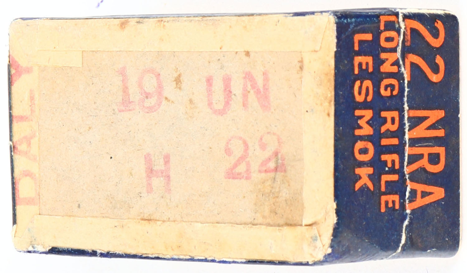 U.S., 22 NRA, .22 Long Rifle, Lesmok, RHWeb: US-51 LR-5, FULL & SEALED, 2pc. Buff box with blue/orange top & side sealing labels, box is solid with excellent color, very minor age soiling, some edge & corner wear, labels are intact. Grade: Excellent + - Value: 20 to 80