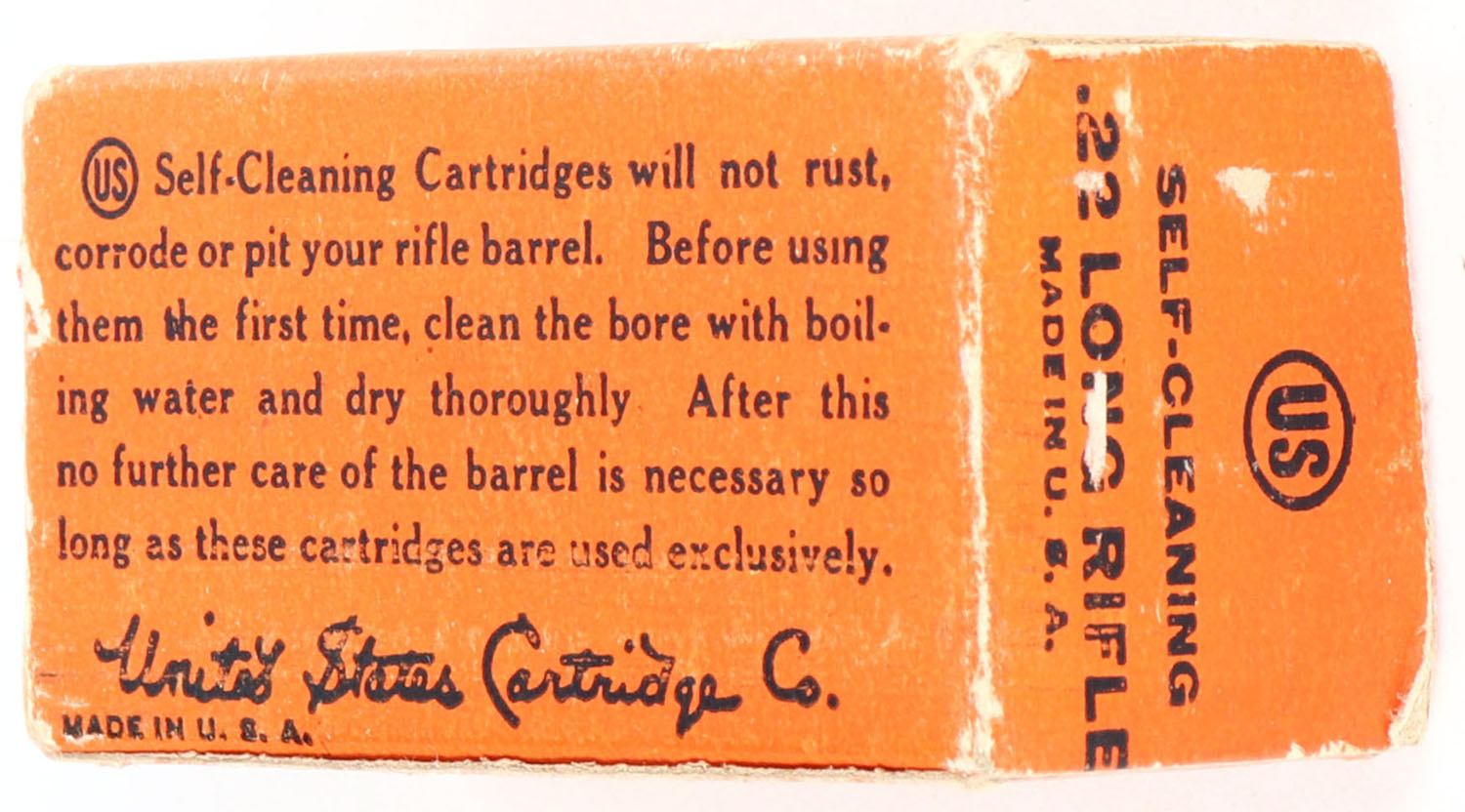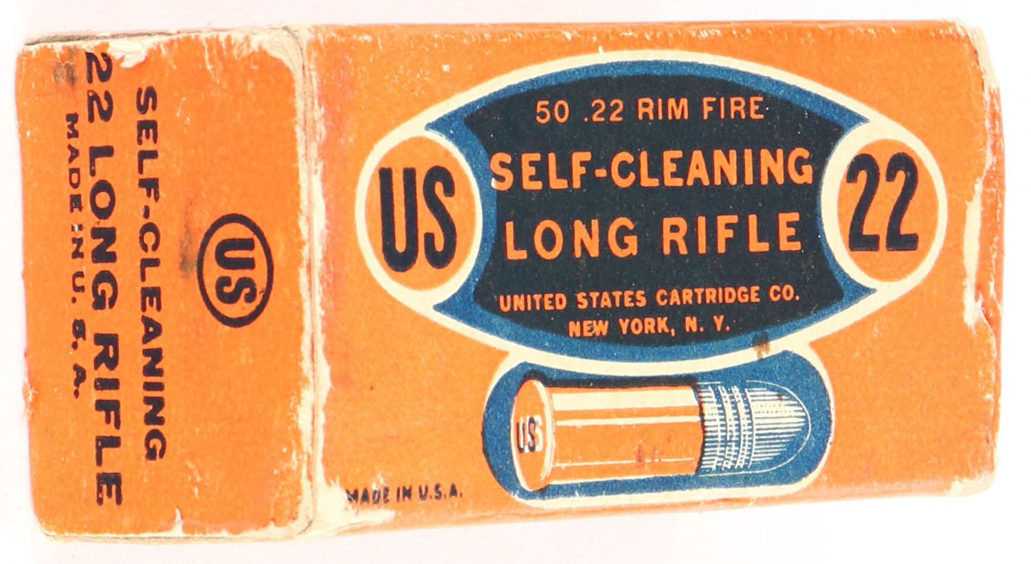 U.S., Self-Cleaning, .22 Long Rifle, RHWeb: US-10A LR-1c, Full, 1pc. Orange & black box, box is solid with very good to excellent color, minor age soiling & color fading, some damage to right end flap, some edge & corner wear, end flaps are solid, ammo is very good. Grade: Very Good + - Value: 8 to 40