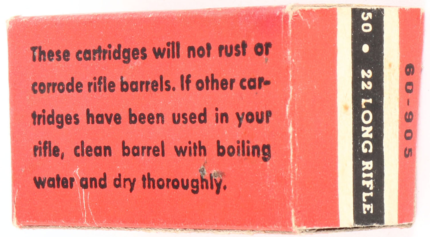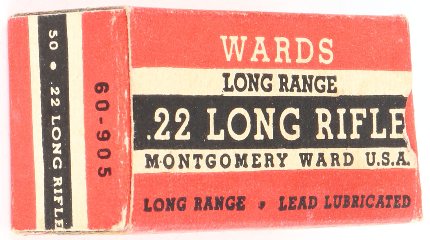 Wards, Long Range Cleanfire, .22 Long Rifle, Lead Lubricated, RHWeb: MW-4B LR-1c, Partial 40rds. 1pc. Red black & white box, box is solid with very good color, age soiling, minor corner wear, edges are mostly crisp, end flaps are solid, ammo is excellent. Grade: Very Good ++ - Value: 6 to 30