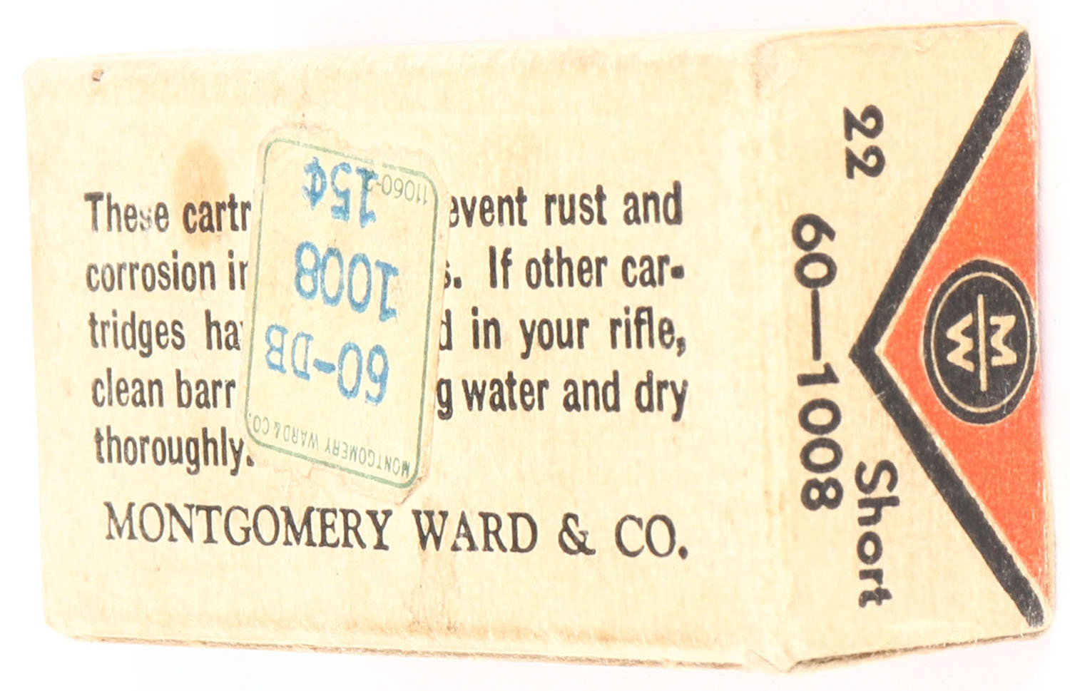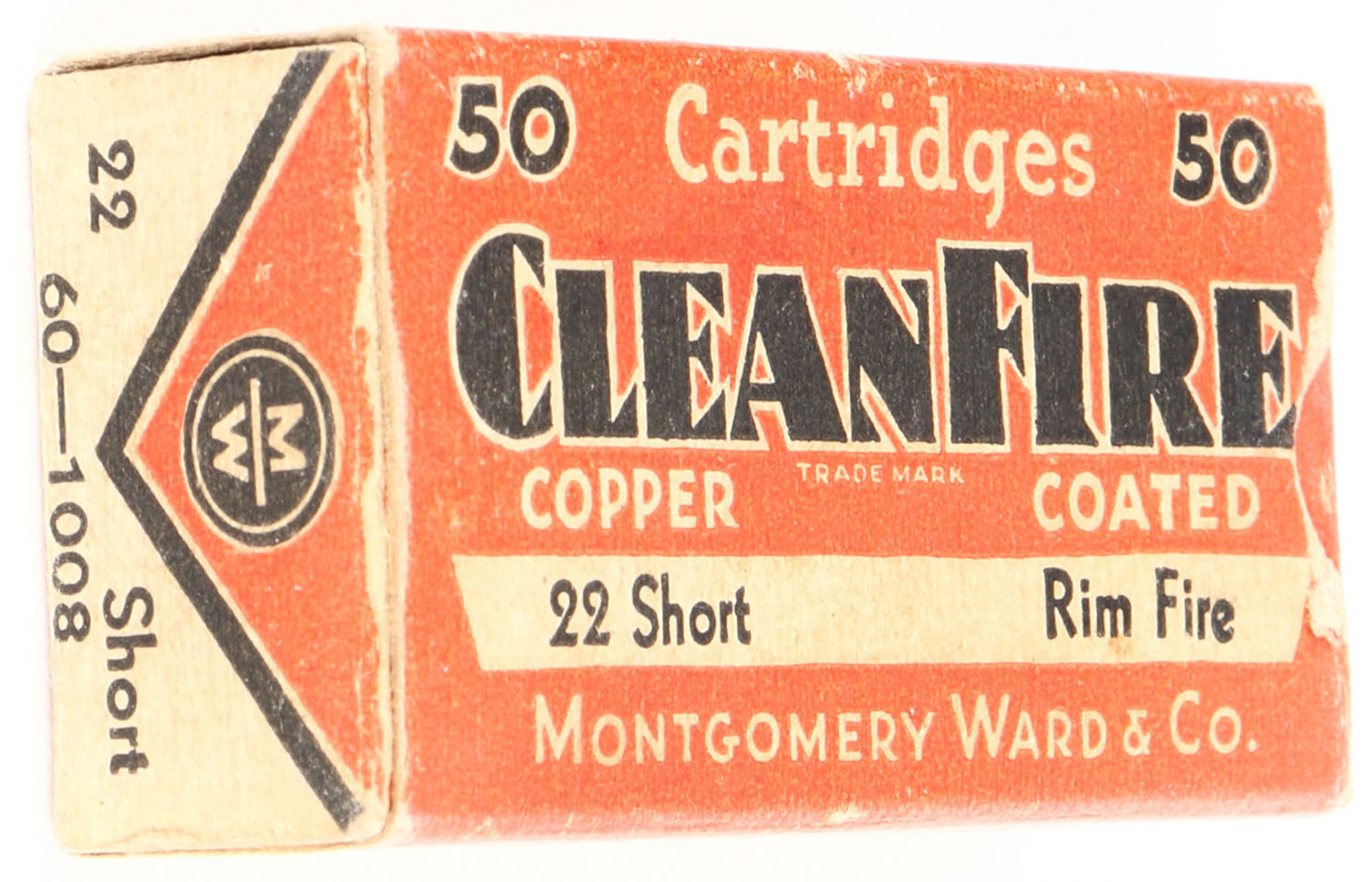 Wards, CleanFire, .22 Short, Copper Coated, RHWeb: MW-3C S-3, Full, 1pc. Red black & white box, box is solid with very good to excellent color, some age soiling, minor edge & corner wear, end flaps are solid, ammo is excellent. Grade: Very Good + - Value: 6 to 30
