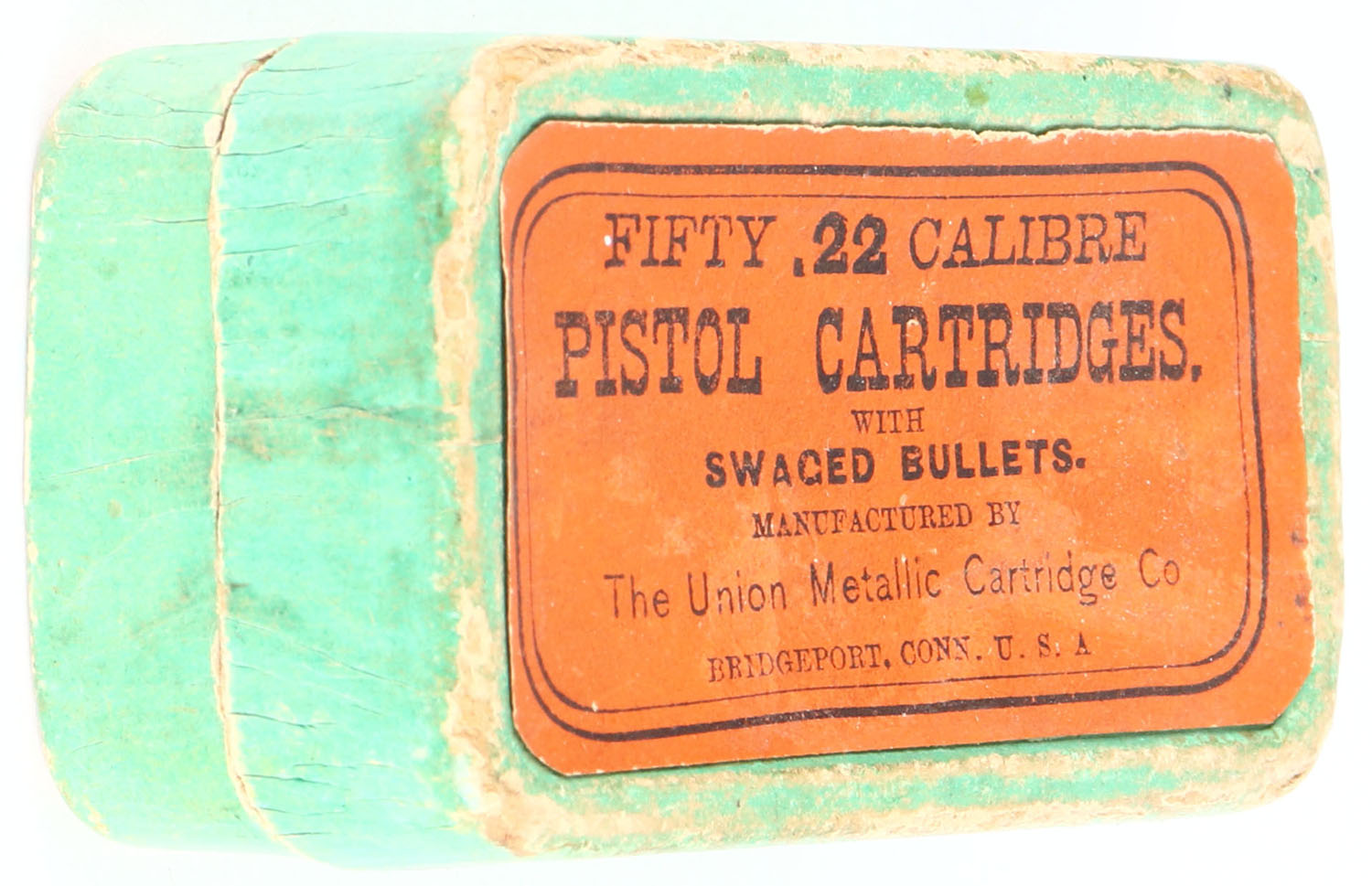 UMC, Pistol Cartridges, .22 Short, Swaged Bullets, RHWeb: UMC-7 S-2b, Partial 29rds., 1pc. Green box with orange top label, side sealing label is gone, box is solid with very good color, some age soiling, edge & corner wear, top label is intact, ammo is good. Grade: Very Good - Value: 20 to 100
