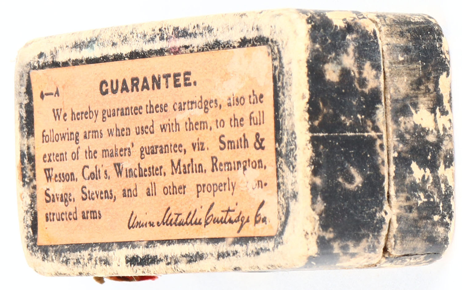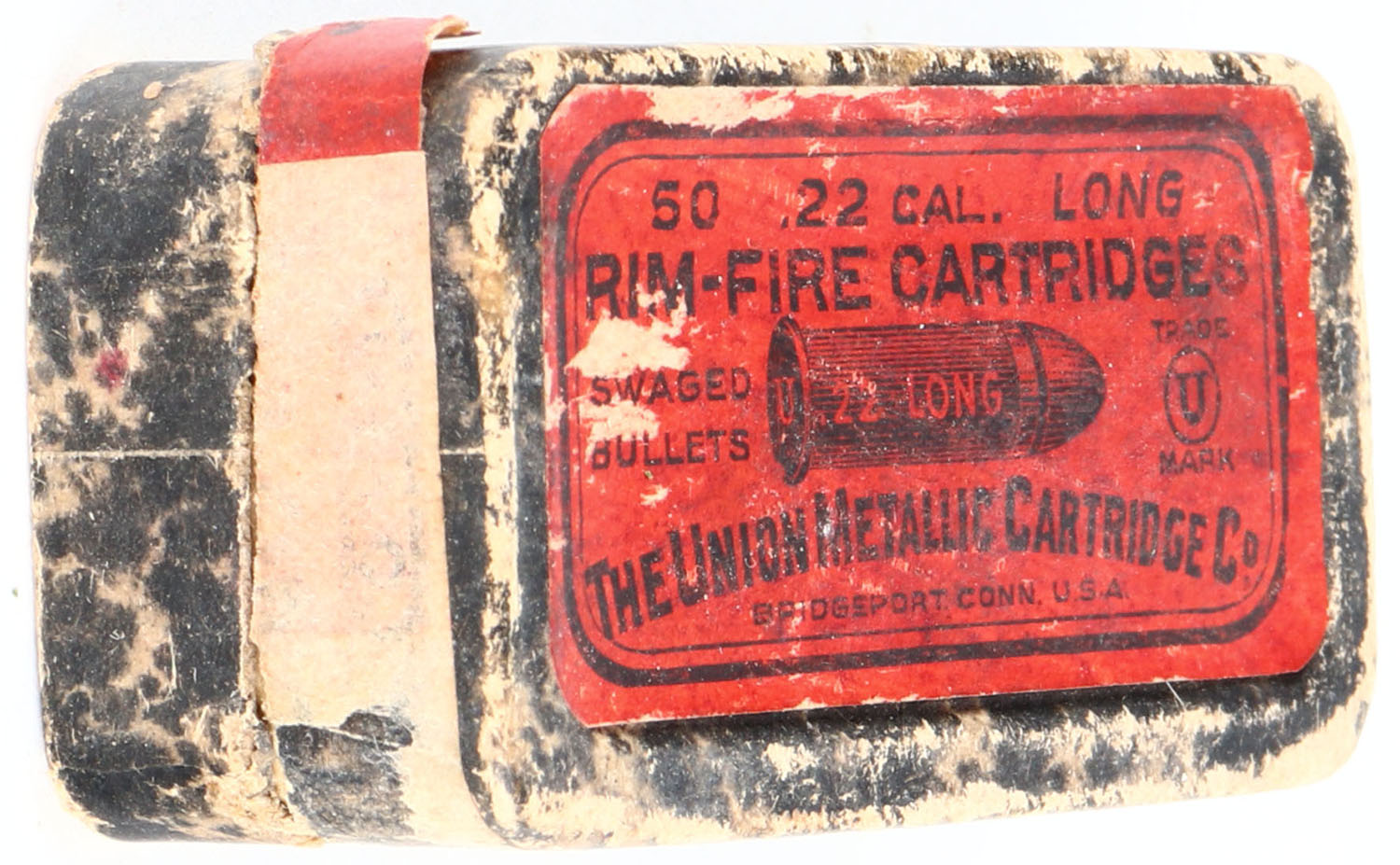 UMC, Rim-Fire Cartridges, .22 Long, Swaged Bullets, RHWeb: UMC-8 L-1a, Partial 34rds., 2pc. Black mottled box with red top & side sealing labels, box is solid with very good color, minor age soiling, shelf wear, some edge & corner wear, side sealing label is 10% intact, ammo is good to very good. Grade: Very Good - Value: 20 to 80
