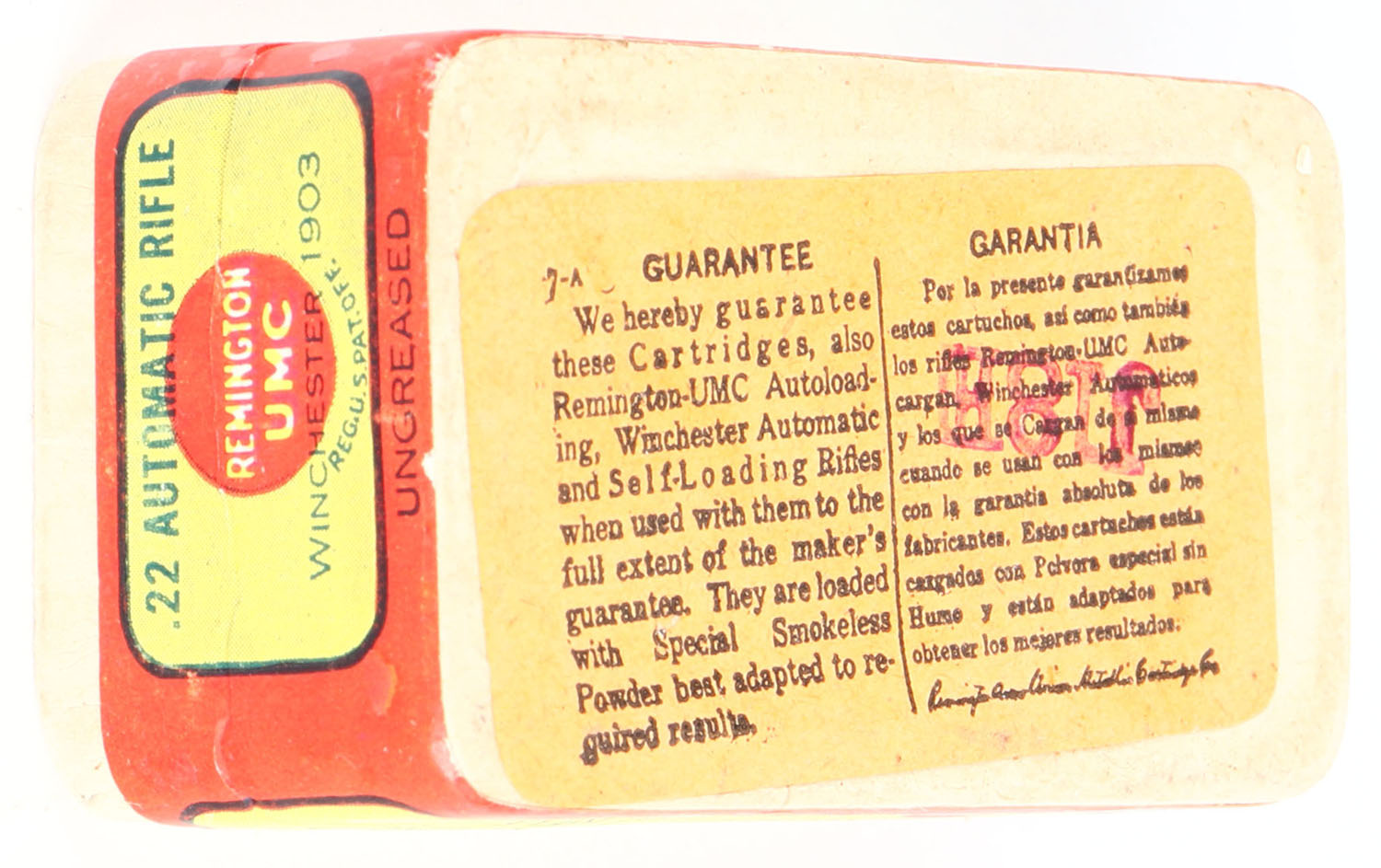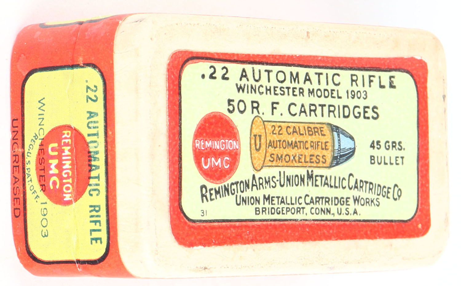 REM-UMC, .22 Winchester Automatic, Ungreased, RHWeb: REM-2 WA-1C, FULL & SEALED, 2pc. Buff box with green/red top & side sealing labels, box is solid with excellent to minty color, very minor age soiling & edge wear, corners are mostly sharp, labels are intact. Grade: Excellent ++ - Value: 50 to 150