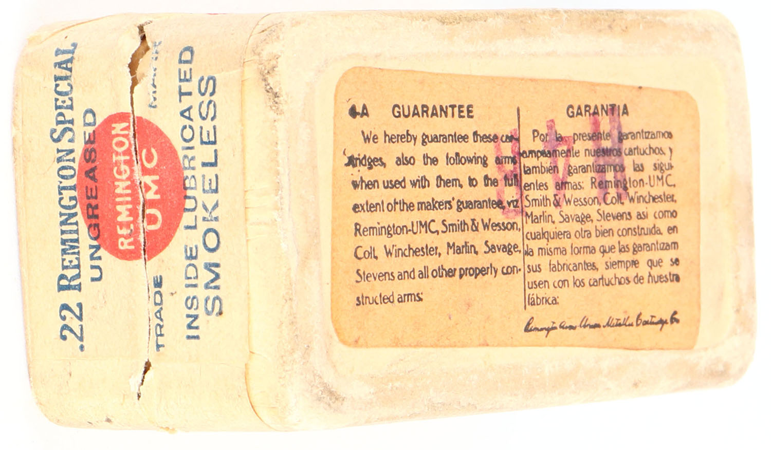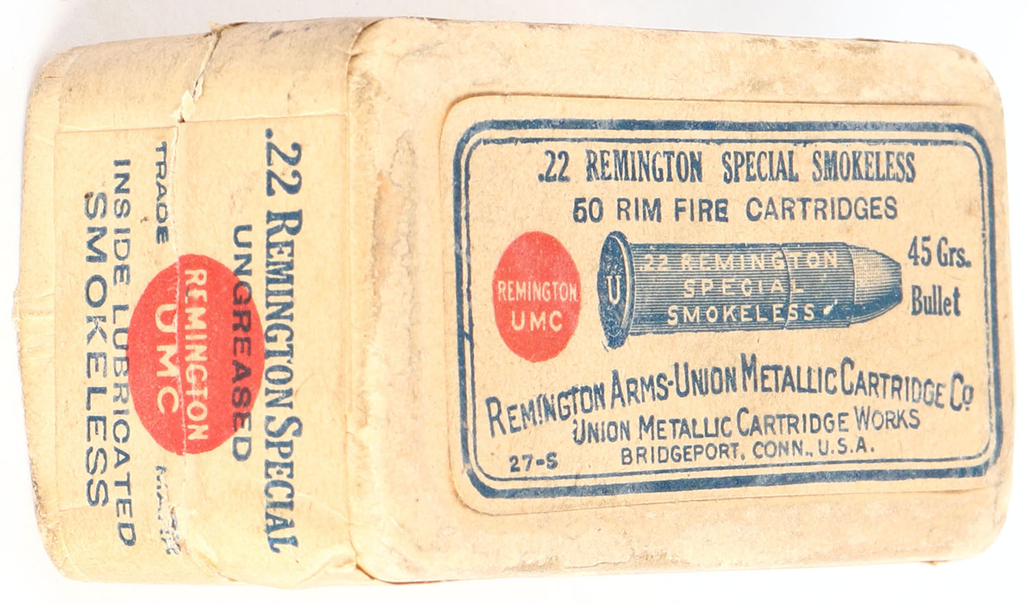 REM-UMC, .22 Remington Special, Smokeless, RHWeb: REM-2 RS-2b, Full, 2pc. Buff box with buff top & side sealing labels, box is solid with excellent color, very minor age soiling & edge wear, very minor corner wear, labels are intact, ammo is excellent. Grade: Excellent - Value: 100 to 300